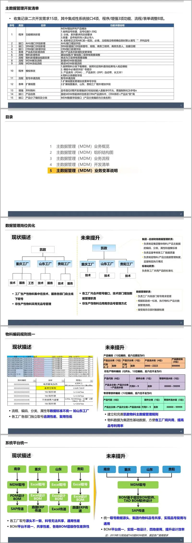 主数据管理流程方面,方案梳理了 8 项核心流程,包括物料新增、变更、冻结、解冻等,重点推动四地数据规则、审核标准与变更流程的统一性。开发清单涵盖 15 项二次需求,包括功能模块新增、系统接口扩展、流程表单调整等,例如为适配开利产品新增专属模块,优化 SRM、CRM 等系统接口字段,确保数据同步准确性。业务变革上,通过合并取号窗口、统一物料编码规则、规范数据管理职责,实现从分散管理到集中管控的转变,其中物料编码分为产品编码、专项零部件编码、非生产物料编码三类,明确编码结构与规则,提升品号利用率与共享性。