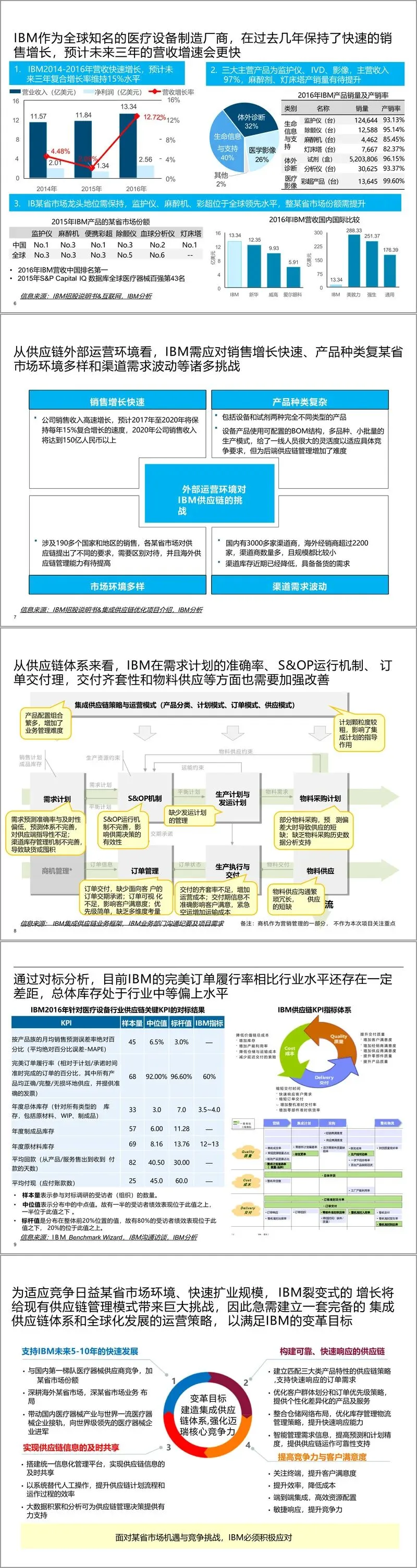 方案开篇深入剖析了行业环境与企业现状。全球医疗器械市场保持稳定增长,2018-2022年复合增长率预计达 5.2%,IVD、心血管、医疗影像等细分领域需求旺盛。国内政策持续推动国产化与高端化转型,为迈瑞医疗带来发展机遇的同时,也提出更高要求。作为行业龙头,迈瑞医疗三大主营产品(生命信息与支持、体外诊断、医学影像)产销率保持高位,但供应链面临多重挑战:需求预测准确率偏低、S&OP 机制不完善、订单交付齐套率不足、海外供应链管理能力薄弱,且设备与试剂类产品的生产、销售模式差异显著,增加了管理复杂度。对标行业标杆,企业完美订单履行率等关键指标仍有较大提升空间。