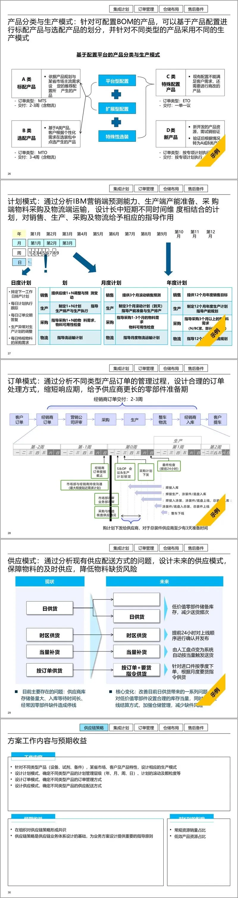基于现状诊断,方案明确了 “构建敏捷、高效、协同的集成供应链体系” 的核心目标,提出从五大维度推进优化。供应链策略层面,针对设备、试剂、售后备件三类产品的特性,设计差异化生产模式(离散型与连续型结合)、计划模式(年 / 月 / 周 / 日多级滚动)、订单模式与供应模式,实现产品全生命周期精准管控。集成计划体系聚焦打通计划流,建立 “经销商 + 企业” 联合需求预测机制,完善 S&OP 产销协同会议制度,优化生产、采购与物流计划的联动衔接,提升供需平衡效率。