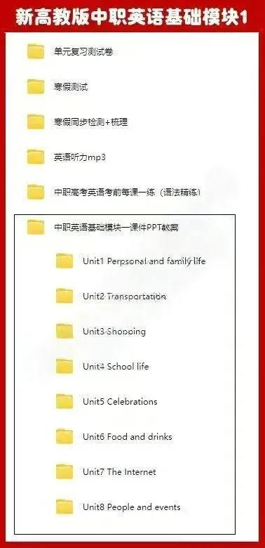 ①新高教版中职英语基础模块1修订版U1-U8包含:课件PPT、配套教案、同步检测+梳理、配套听力MP3、单元复习测试卷、寒假测试、考前每课一练。