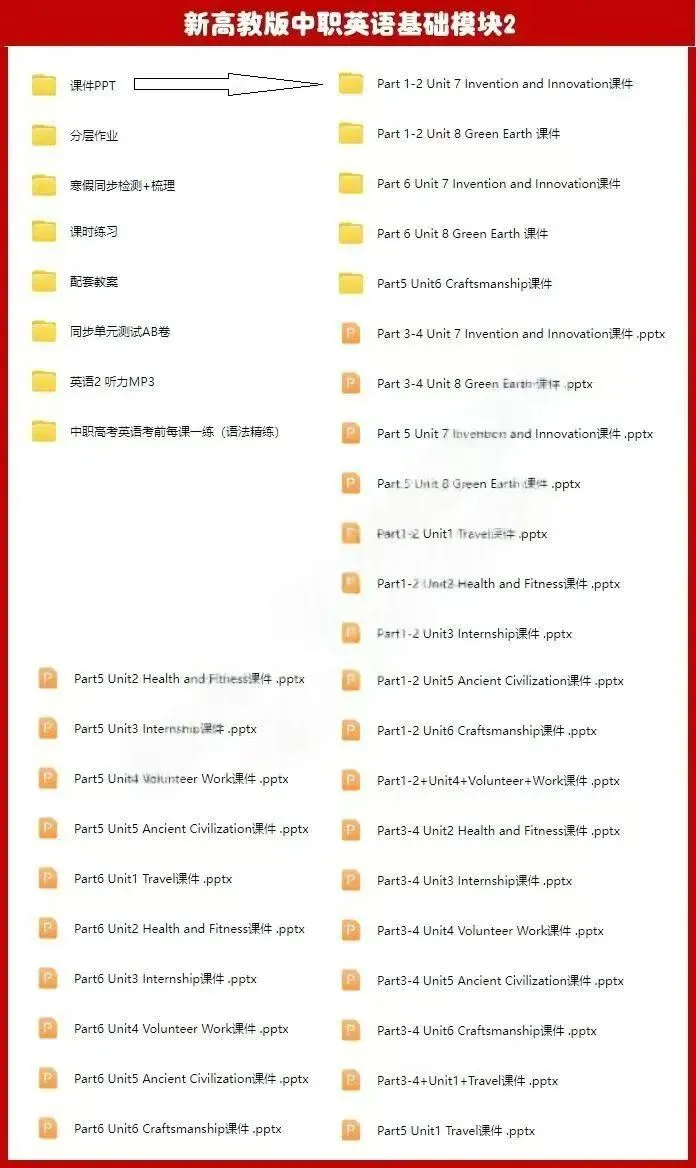 ②新高教版中职英语基础模块2修订版U1-U6包含:课件PPT、配套教案、课时练习、同步检测+梳理、配套听力MP3、单元测试AB卷、分层作业、考前每课一练。
