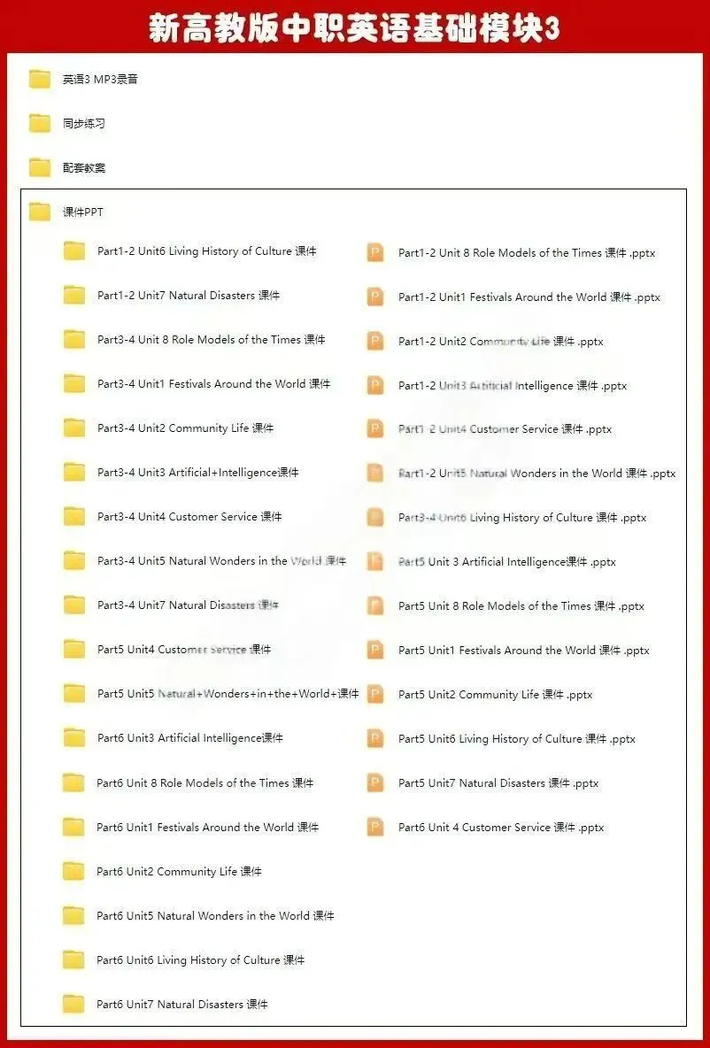 ③新高教版中职英语基础模块3修订版U1-U8包含:课件PPT、配套教案、同步练习、配套听力MP3。