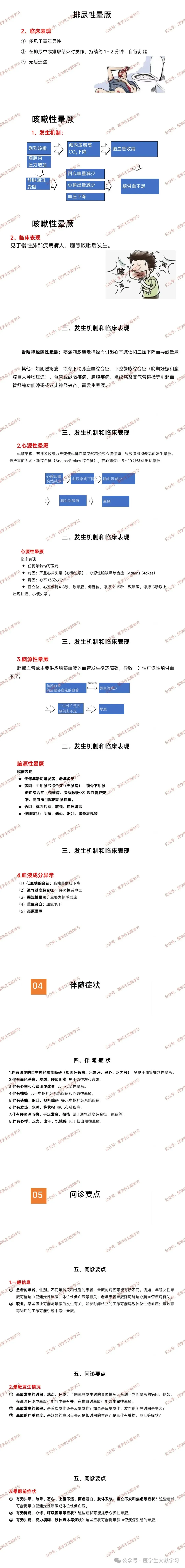 血管抑制性晕厥(占晕厥的 70%):好发于年轻体弱女性,诱因包括疼痛、情绪紧张等,晕厥前有头晕等症状,数秒或数分钟后自然苏醒,无后遗症。