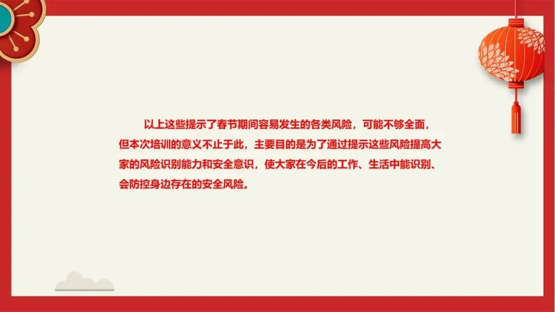 为护航万家团圆,助力企业及个人平安迎新年,“安全航行”特别整理汇总了一份《节前培训节后复工课件系列【第3套】春节节前节后课件》,从网络精心搜集并分类整合了72个实用、即用的安全教育培训课件,涵盖节前隐患排查、出行安全、居家消防、应急处理、复工复产等重点场景,助你系统筑牢节日安全防线。