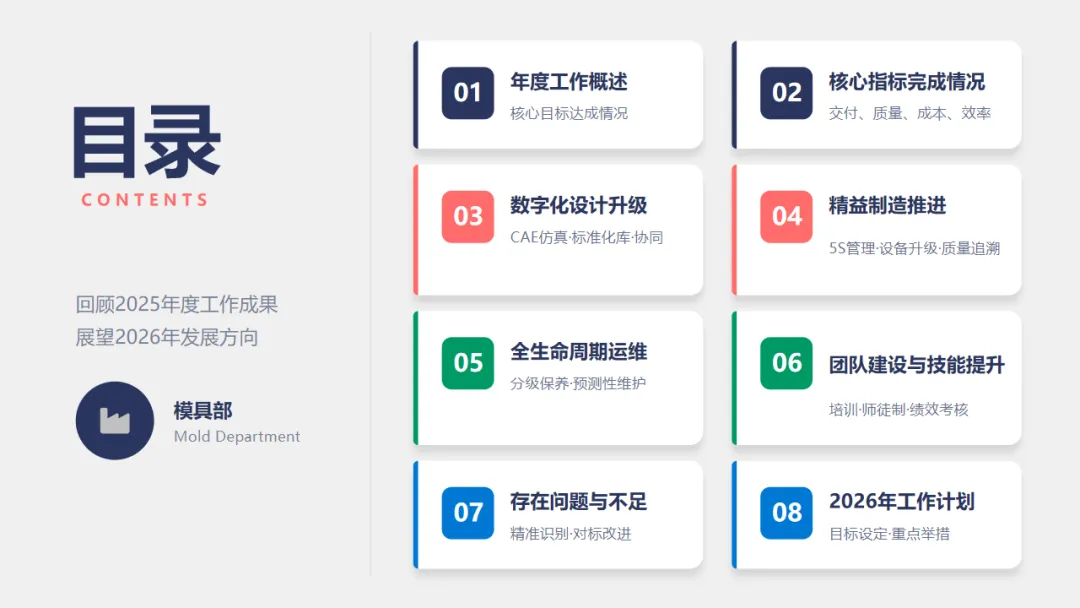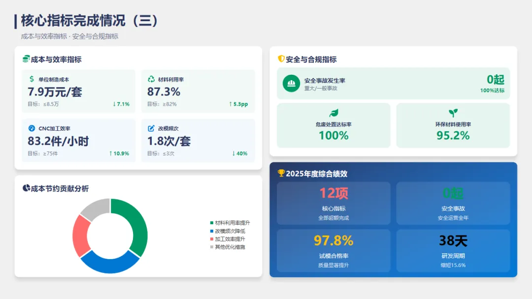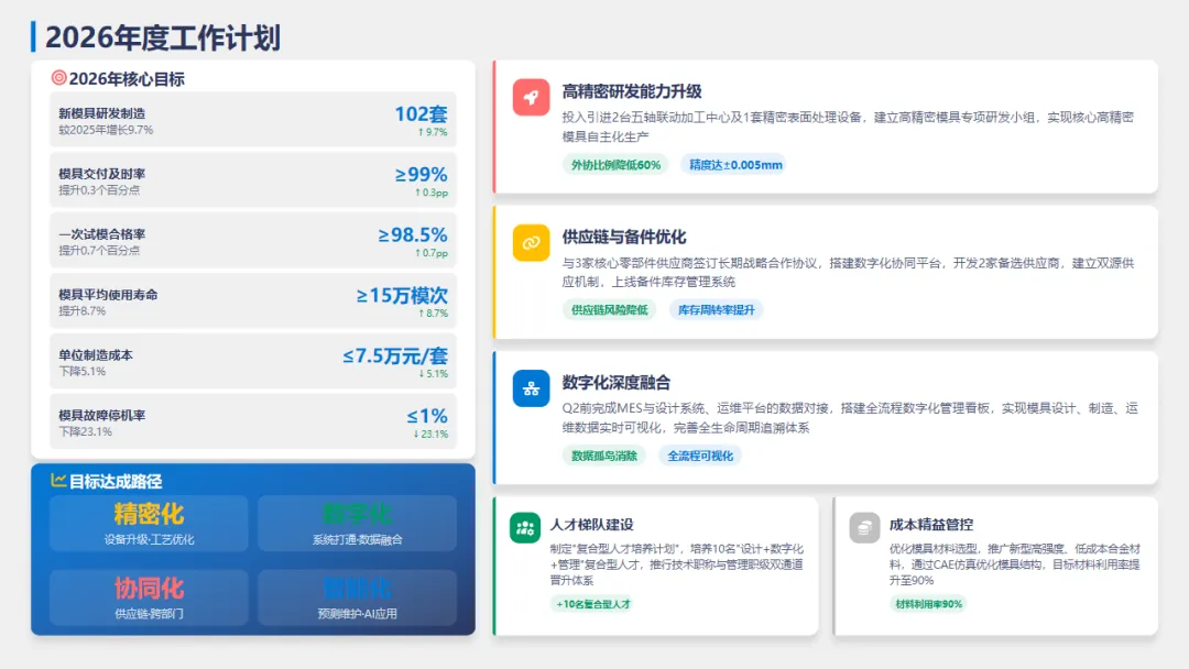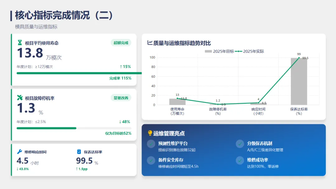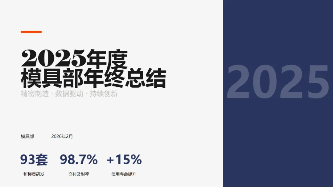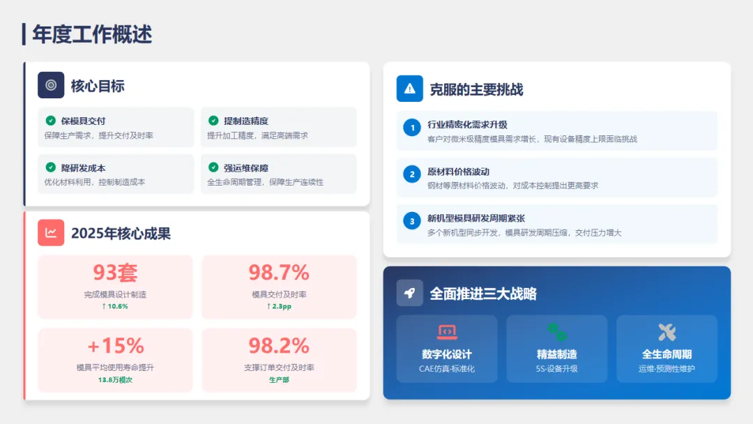 2025年,模具部围绕年初公司制定的工作目标,应对行业变化和外部挑战,稳步推进模具设计、制造精度的提升、成本控制与运维保障等工作,我们克服了精密需求升级、原材料波动、研发周期紧张等困难,实现了模具设计和制造的持续提升。今年,我们完成了XX套模具的设计和制造,比去年增长了10%;模具的使用寿命也提高了15%,交付准时率98.2%,顺利达成了订单及时交付的目标。