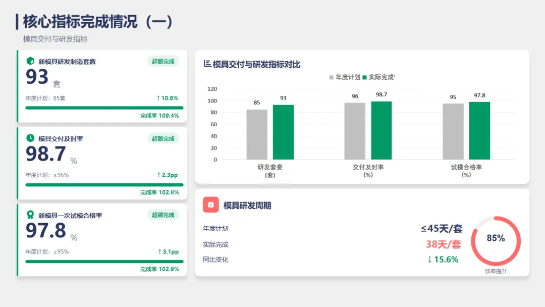 模具交付及时率:从96%提升至98.7%,比去年提升了2.3个百分点。