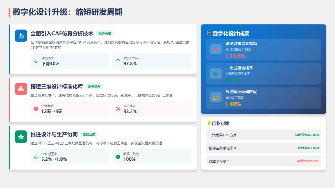 引入CAE仿真分析技术,减少了改模频次,提升了设计效率,减少了35%的重复设计工作量。