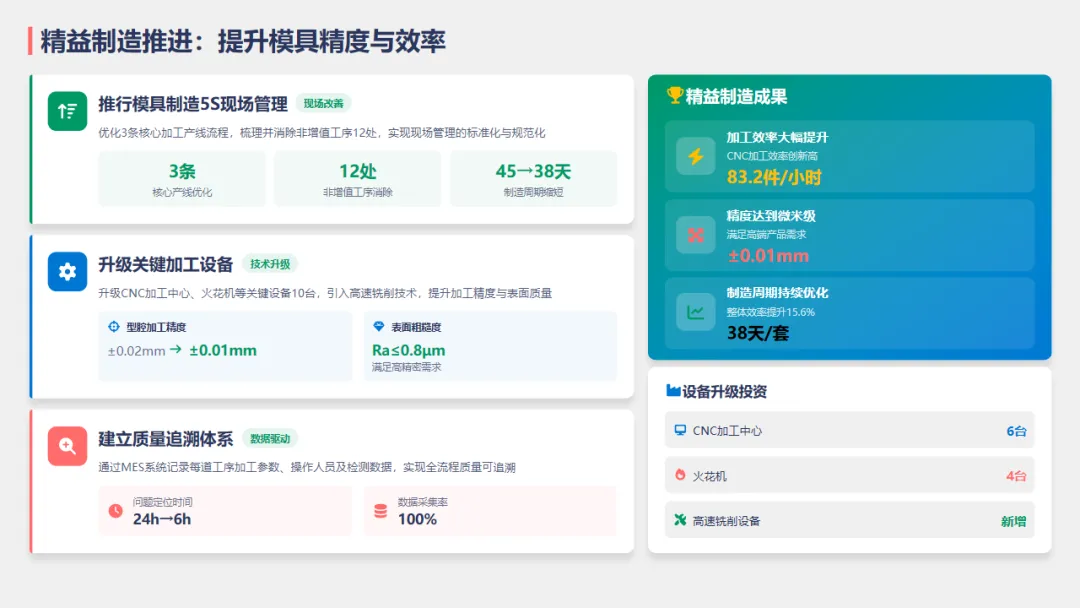 推行模具制造5S现场管理,优化了生产流程,模具整体制造周期缩短至38天。