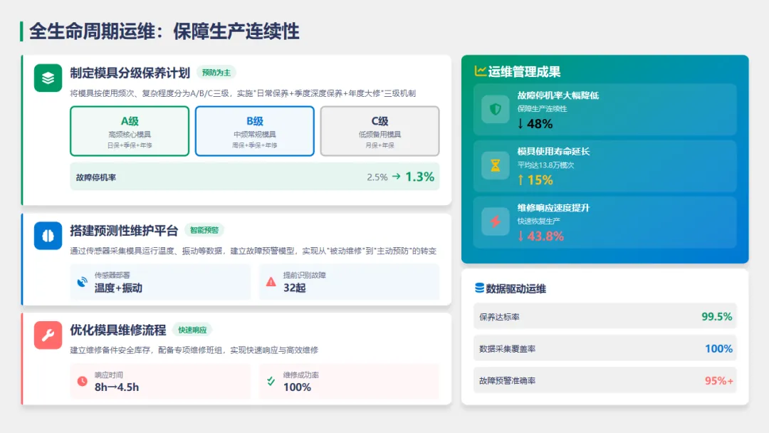 制定了详细的模具保养计划,确保模具在使用中的高效运转,模具故障停机率减少至1.3%。