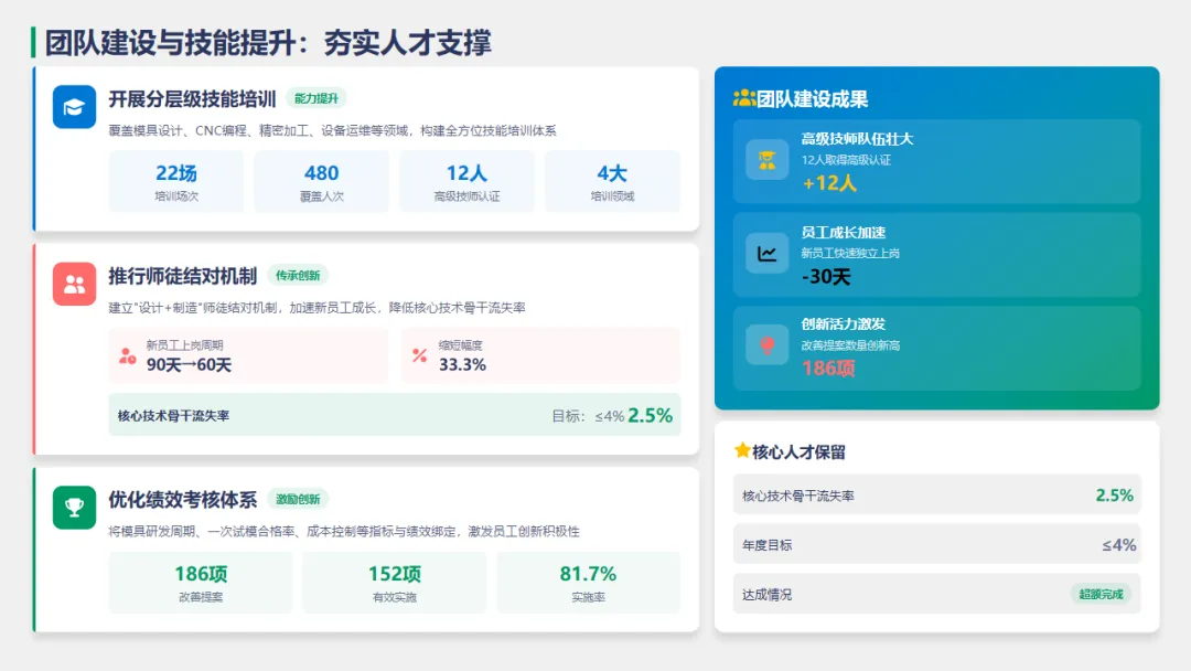 全年组织了22场培训,提升了员工的专业技能,同时加强了“设计+制造”师徒结对机制,缩短了新员工的独立工作周期。