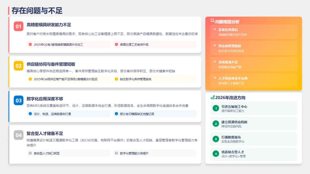 2.供应链与备件管理:部分模具核心零部件依赖单一供应商,存在供货不及时的风险;备件库存管理也未实现数字化,影响了维修效率。