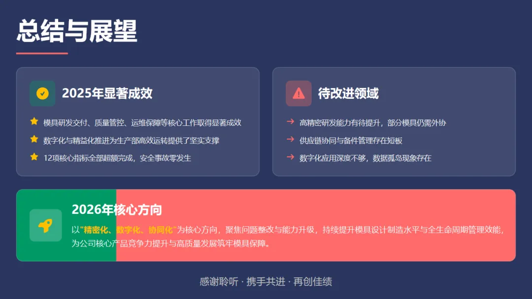 2025年,我们在模具设计、制造、质量管控等方面取得了很大的进展。虽然还存在一些挑战和短板,但通过不断的技术革新和团队努力,我们逐步走向更加精密、数字化的未来。2026年,我们将继续聚焦提升高精密模具研发能力、加强供应链管理,同时深入推进数字化建设,为公司提供更加稳固的技术保障。