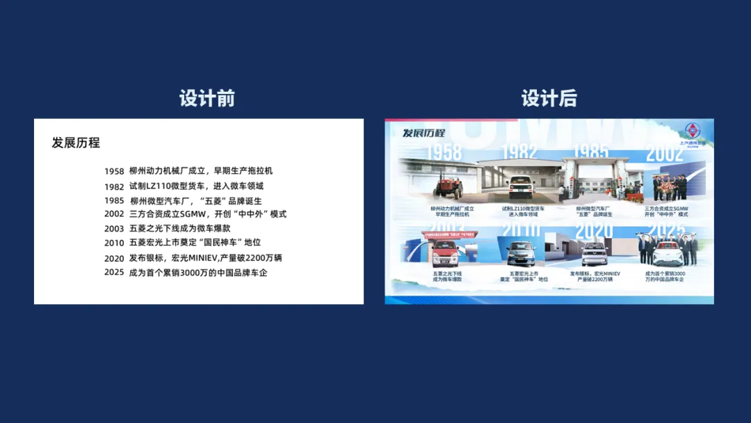 根据封面文字构思,面对较少文字的封面就可进行场景化。第一步:把原稿字体改为与LOGO字体相接近的字体,对比突出。第二步:根据主题进行构思,营造出一个绿色生态的场景并植入品牌产品,给人一种开上五菱迎接美好生活的既视感。第三步:可尝试在画面左下角的绿植地面加入一个五菱的造车工厂来呼应主题中的“造”,在画面感官上有一种从绿色源头工厂制车并落地在高架桥上行驶的视觉感。第四步:既然有了工厂和产品,那么还可以在高架公路的后面加入一个五菱汽车的员工,让三者形成一个闭环,工厂制车-五菱人-产品,通过人物手中五菱汽车,准备放在公路上的奔跑,寓意着品牌精益求精,通过造车让人民过上美好生活。第五步:画面整体比较饱和了,但是如果细看画面内容,其实工厂,人物,汽车三者之间没有一个很好的关联,那么根据LOGO形态,我用到线条的形式让三者之间进行连接,再在人物的手和公路的位置上做了一个开口,就能有效的进行关联。第六步:最后可因画面色系太多太满,可以加入渐变形状和品牌英文,线条纹理来进行简单修饰即可,创意感故事感拉满。图文简介页排版也属于常规页面之一,一般页面中有单张或多张图片配合单段或多段文字叙述。第一步:原稿内容已经非常简洁了,那么根据文字的信息,了解到是关于上海五菱企业的介绍,那么可以抓住2个重点信息,前身和五菱总部,加入这个2个部分的建筑图示就能非常直观的展现出企业的历史到至今的样貌,同时将年份数字放大,让观众阅读一目了然。第二步:把前身机械厂的产品拖拉机和目前五菱的三大核心品牌产品的主打车型巧妙的放在建筑顶面上,内容清晰,画面创意,同时可在建筑体之间加入一个云层,既能提升空间层次感也能弱化建筑之间颜色杂乱的问题。第三步:在原稿之上继续加入关于五菱的文字介绍,同时在版权结构板块上加上线条和形状,再把关键数据换字换色来对比突出。第四步:最后在画面中融入英文和延续封面页的背景图即可,高级感瞬间出来了。时间历程页面,由于传递的内容比较多,所以排版方式尽量选择简洁为主,能让人一目了然。第二步:让图片展示更有创意,可提取出图片中的主体元素,通过紧密的摆放,视觉上更像是让整体连接在一起的图示。第三步:在两行历程图示之下加入一个地面元素,整体图示展示更加和谐了。第四步:最后利用色块、云层元素以及英文等修饰,整个画面质感拉满又清晰明了。产品页排版也属于常规页面之一,一般页面中有单张或多张图片配合单段或多段文字叙述。第一步:为三个产品加入组合形状,更换原稿字体及配色。第二步:在原稿之上继续添加关于车型的亮点介绍,更加丰富饱满。第三步:最后可在各车型中加入汽车内饰图来修饰,图文并茂,搞定。源文件已放入星球啦: