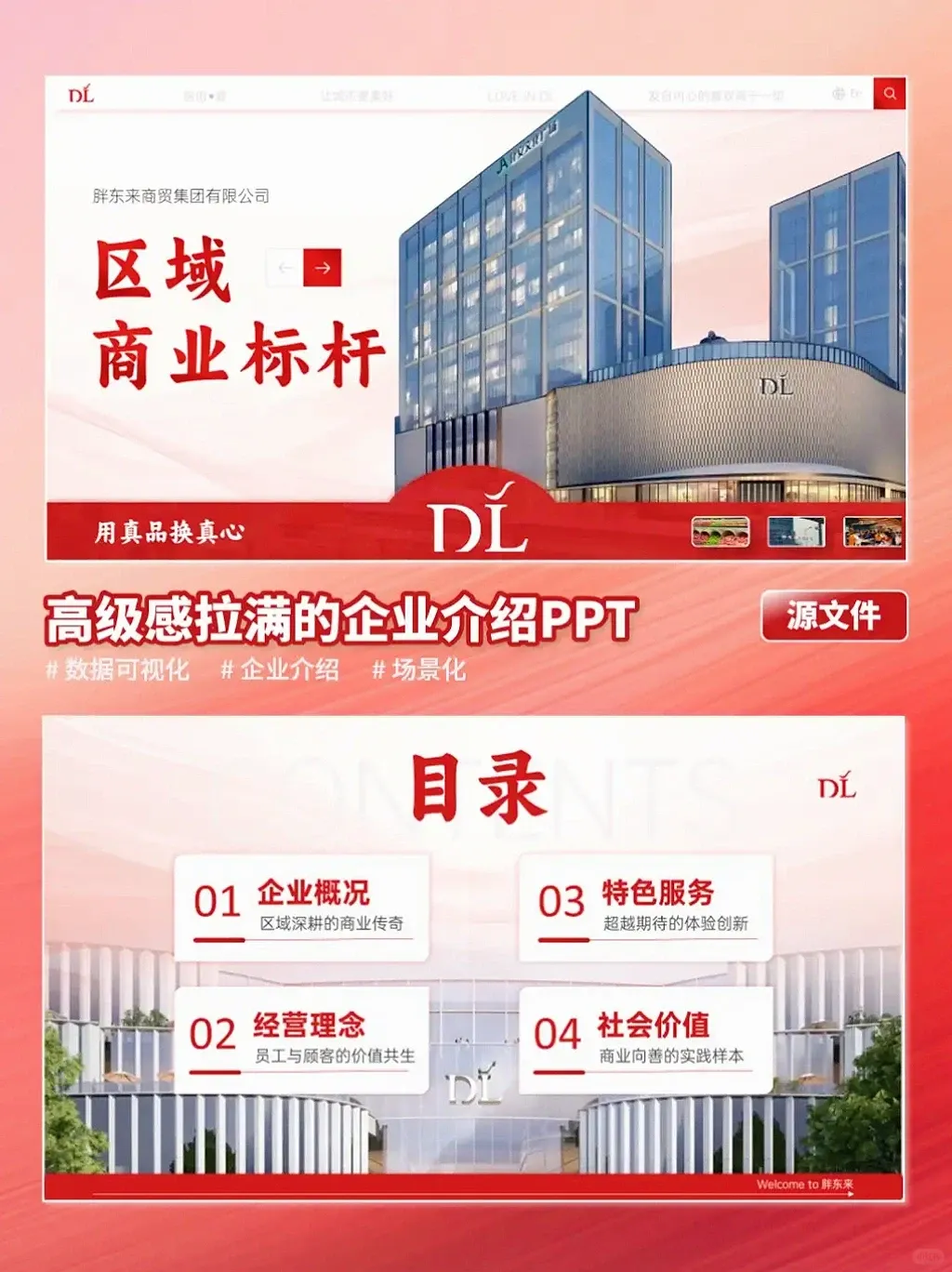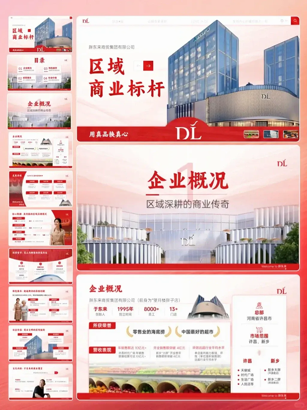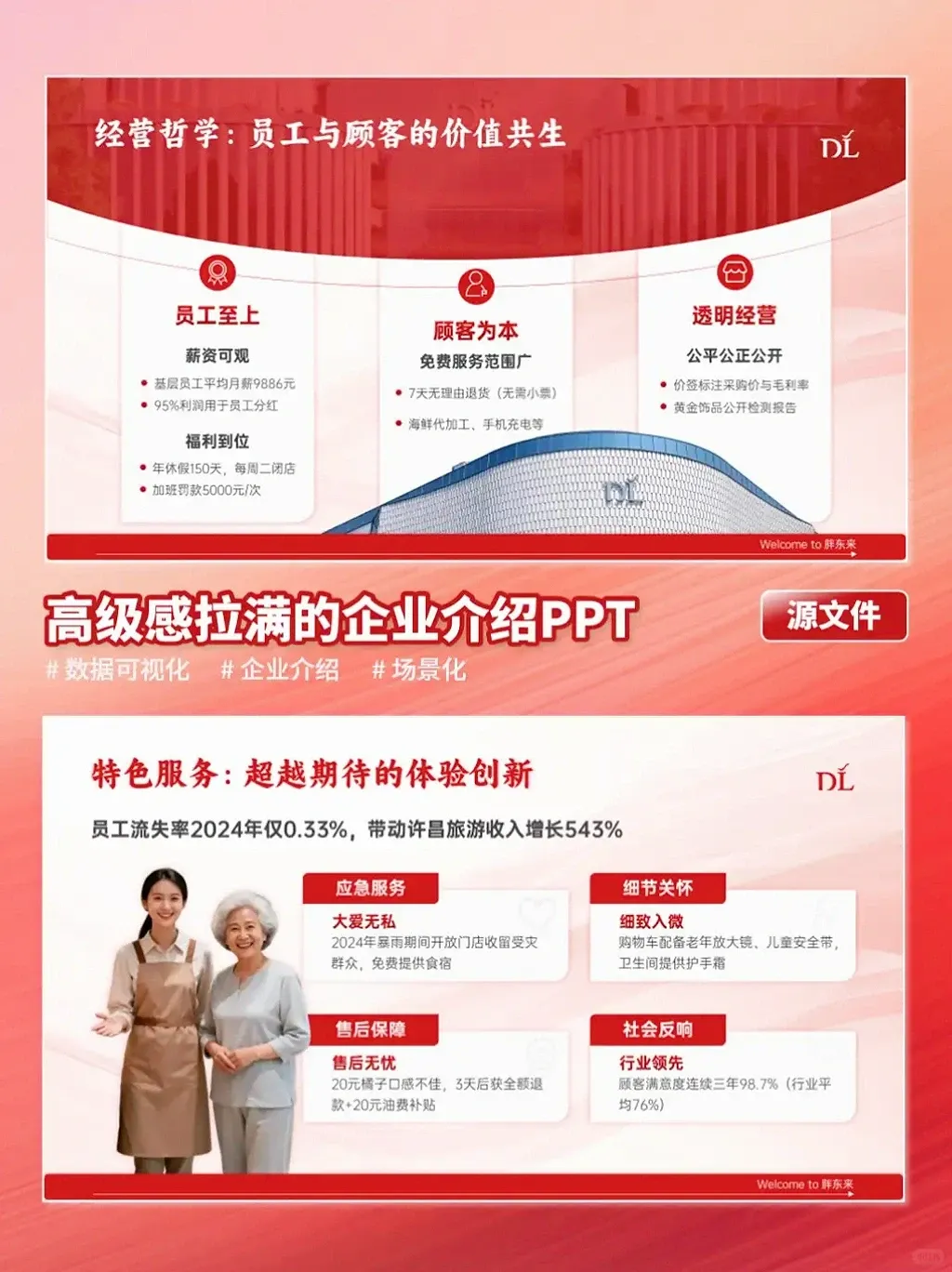 如果你也需要一份既能展现实力、又能传递个性的PPT,欢迎联系秋叶PPT定制设计~封面胖东来标志性大楼往这一摆,气场直接拉满,“DL”logo + “用真品换真心”标语,强化品牌感;