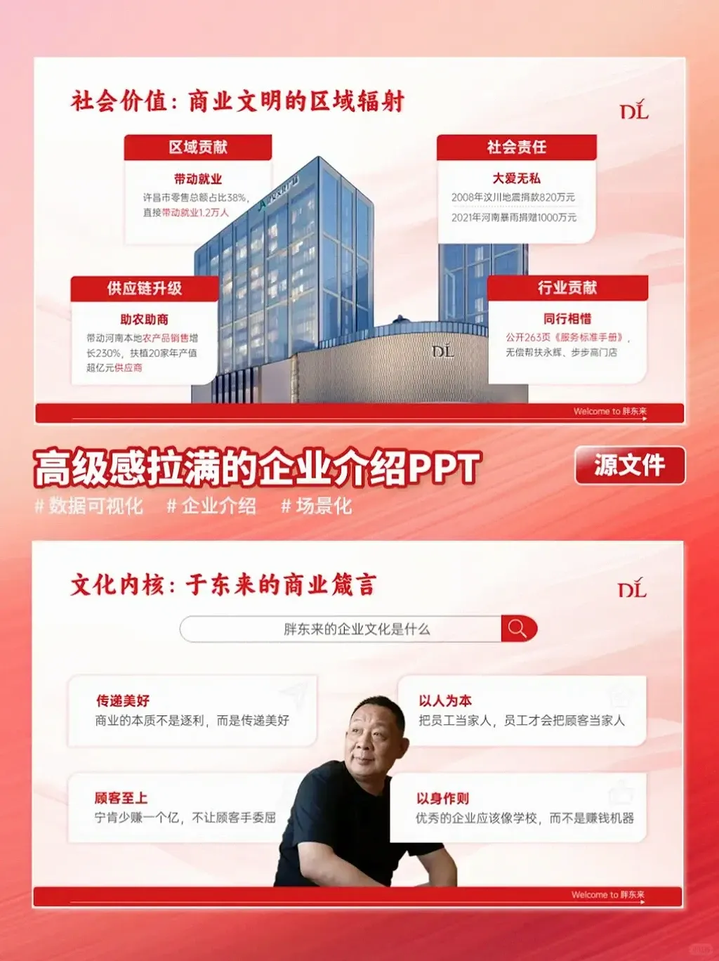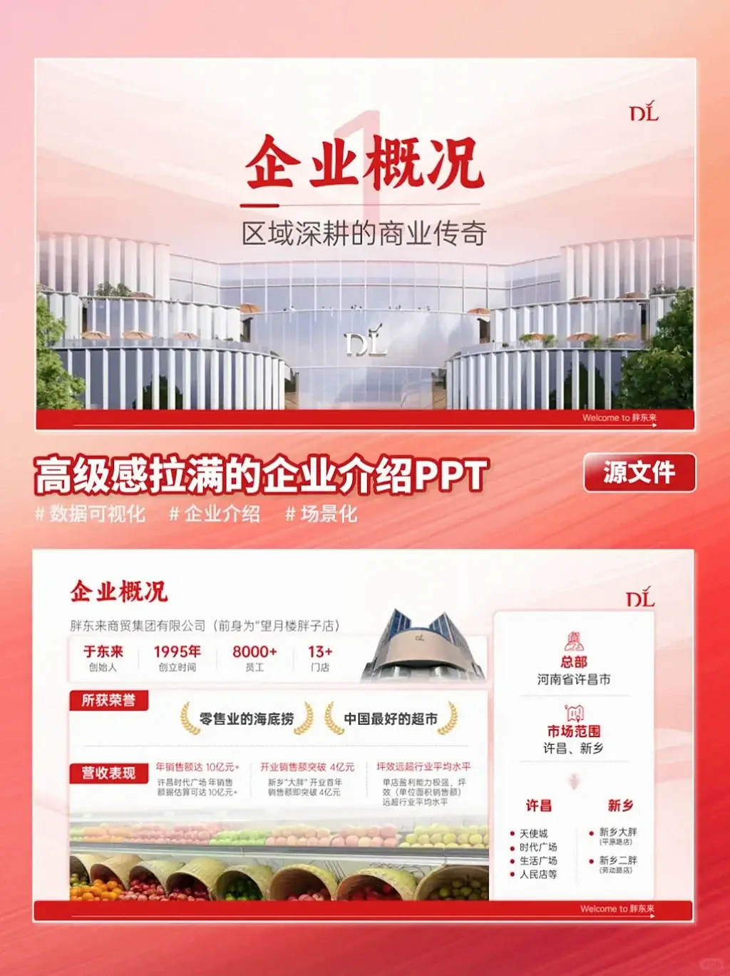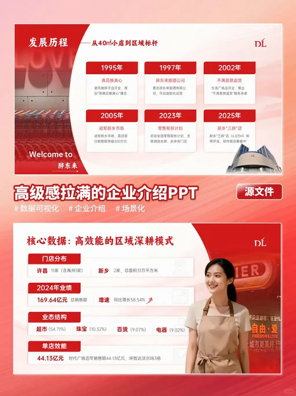 如果你也需要一份既能展现实力、又能传递个性的PPT,欢迎联系秋叶PPT定制设计~封面胖东来标志性大楼往这一摆,气场直接拉满,“DL”logo + “用真品换真心”标语,强化品牌感;