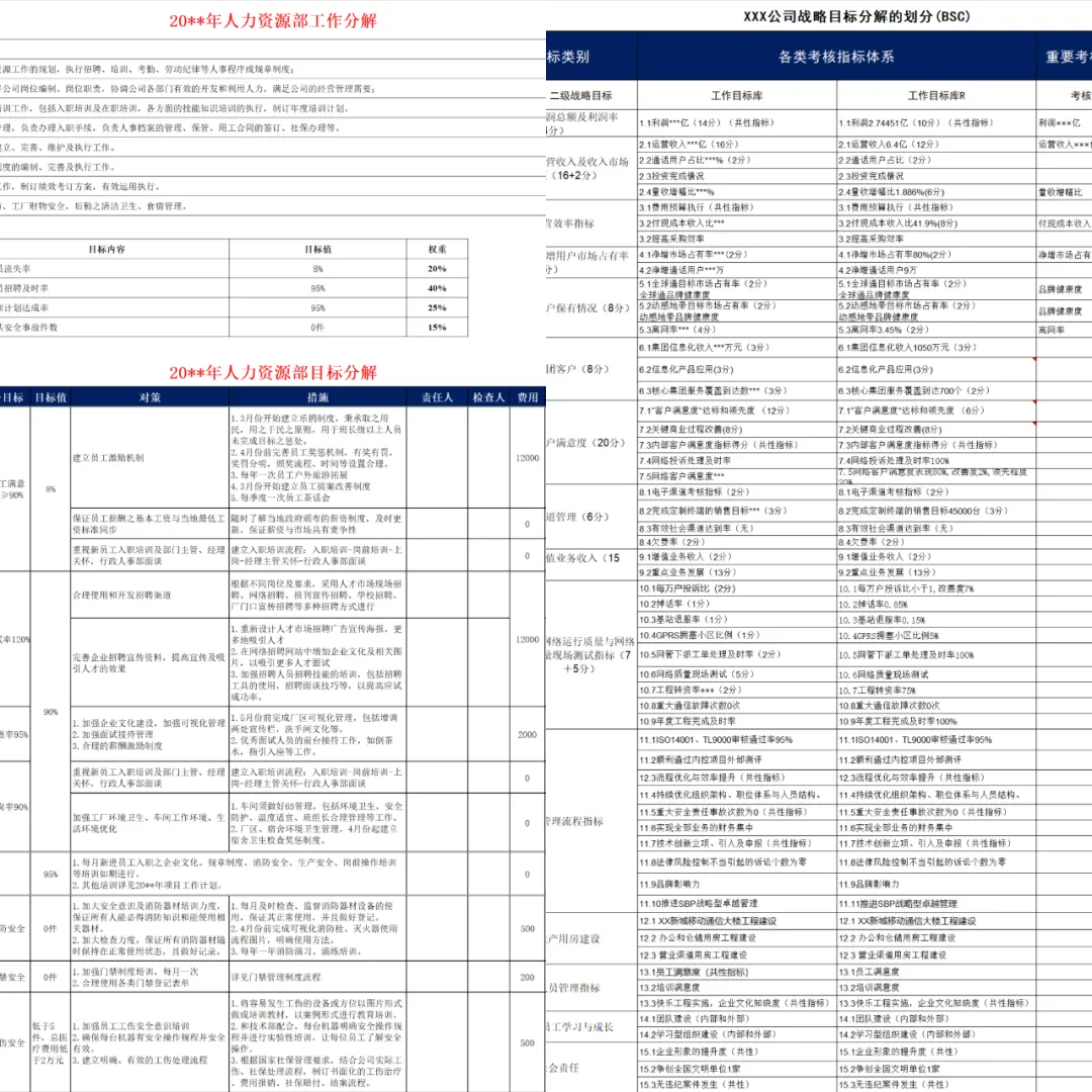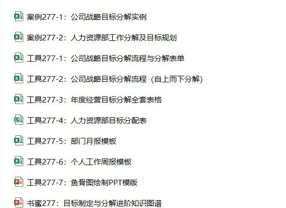 公司的大目标,只有分解到部门和个人,才能落地和实现。我们内容团队耗时半个月制作了一套体系资料——《年度目标制定与分解进阶知识图谱》,共10份~ 原创书蜜277期资料合计2份PPT+8份excel资料~涵盖:目标战略分解实例、目标分解流程、目标分解全套表格、周报&月报模板、人资部目标分配表、鱼骨图ppt模版等内容一应俱全。全套都有了