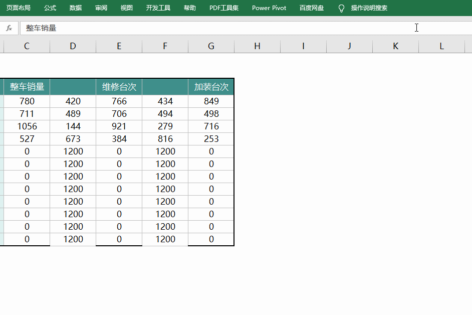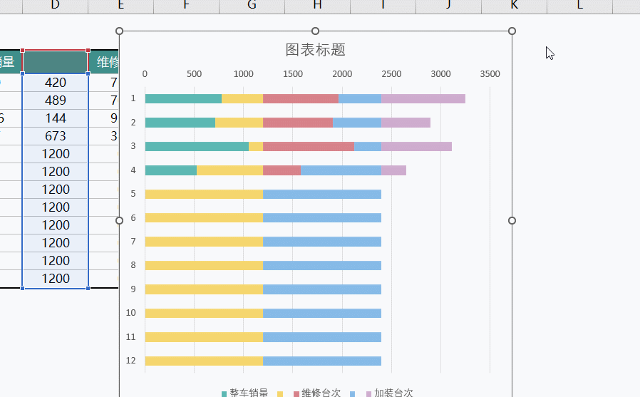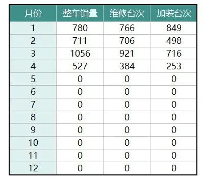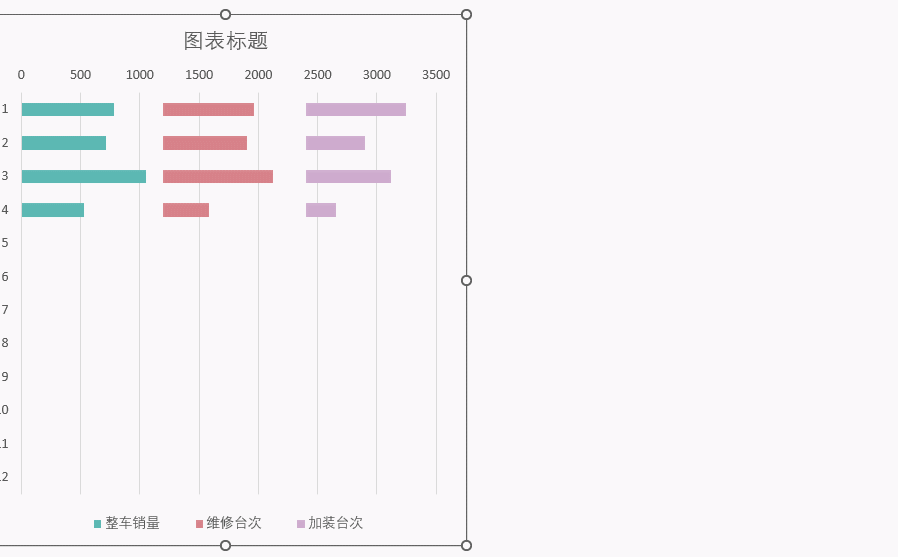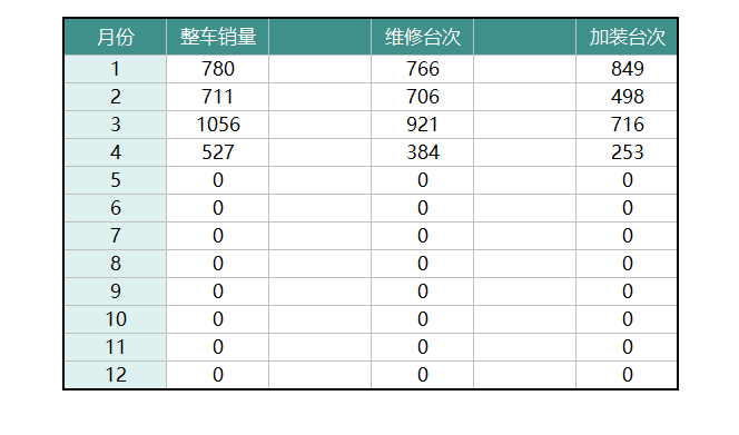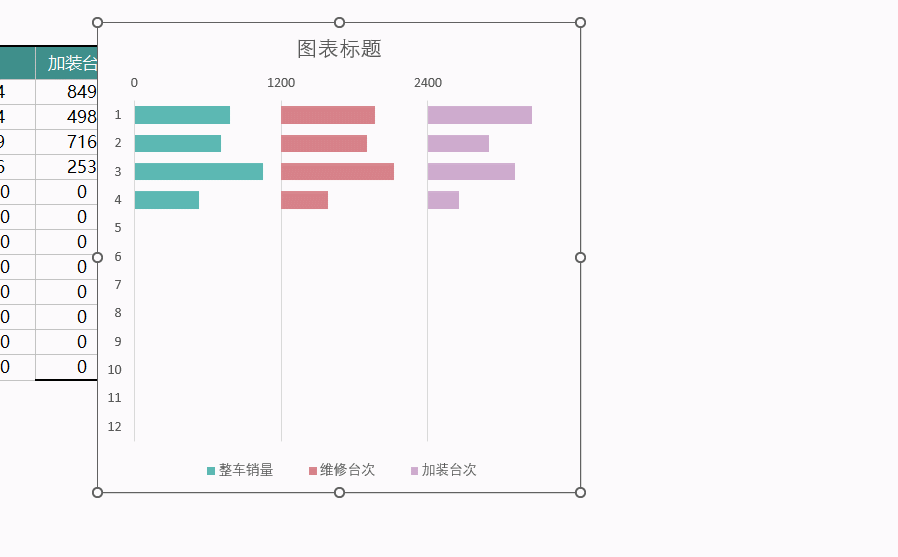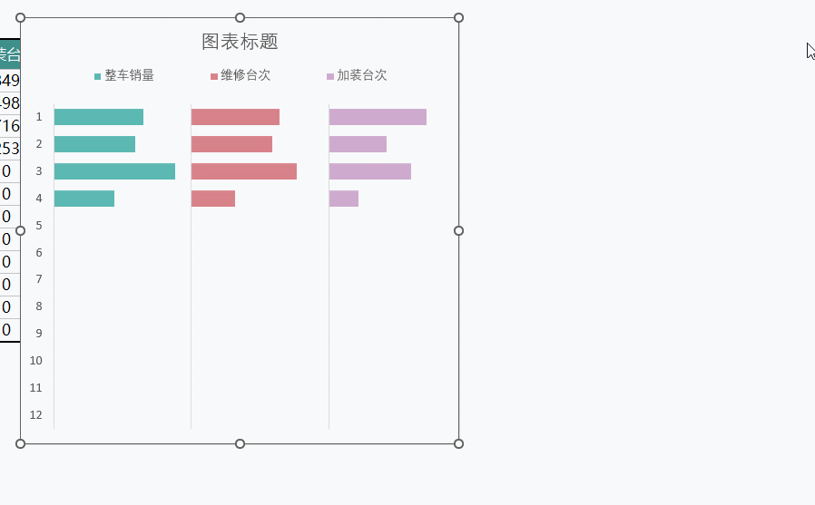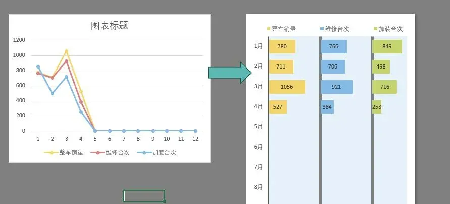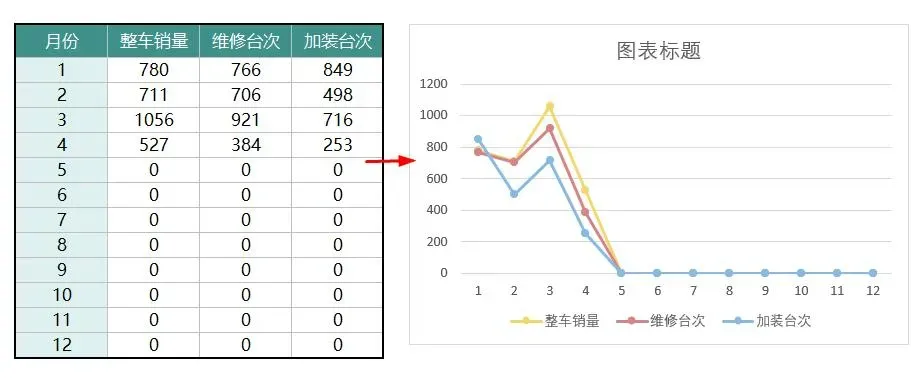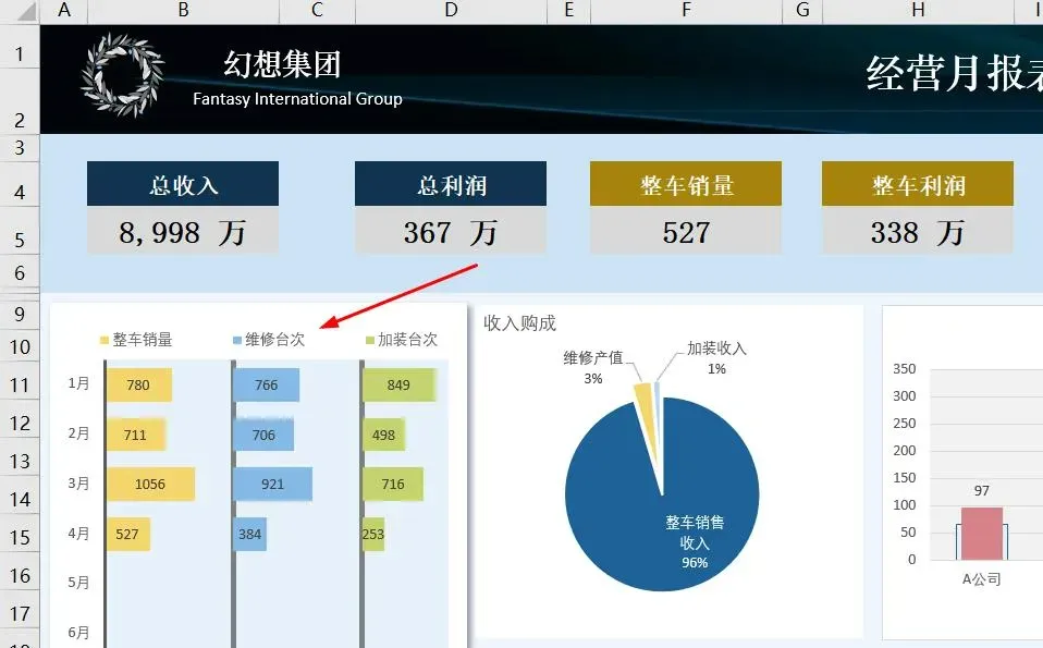 如下图所示,需要在面板的右侧同时显示全年整车销量、维修台次和加装台次3种数据。