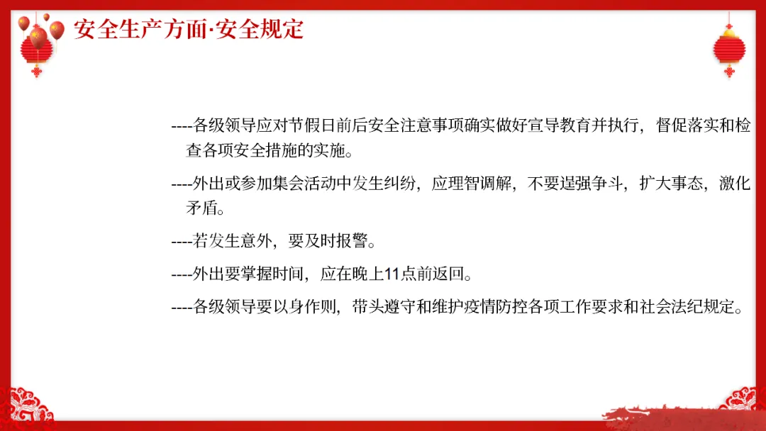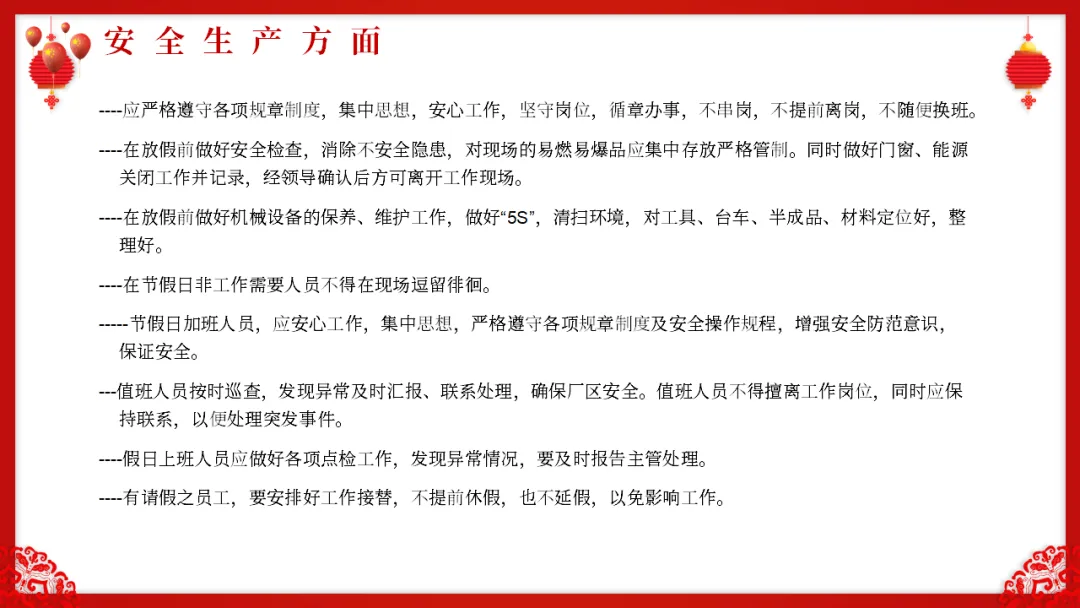 针对上述心理特点,我们要求所有员工在节假日前后必须严格遵守以下安全规定: