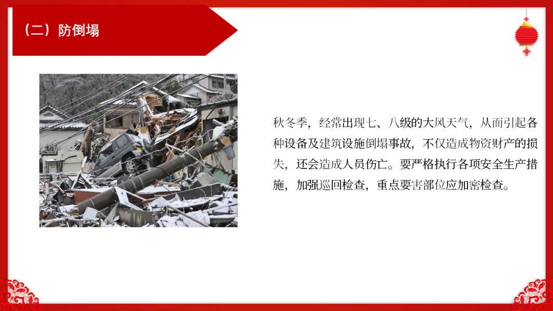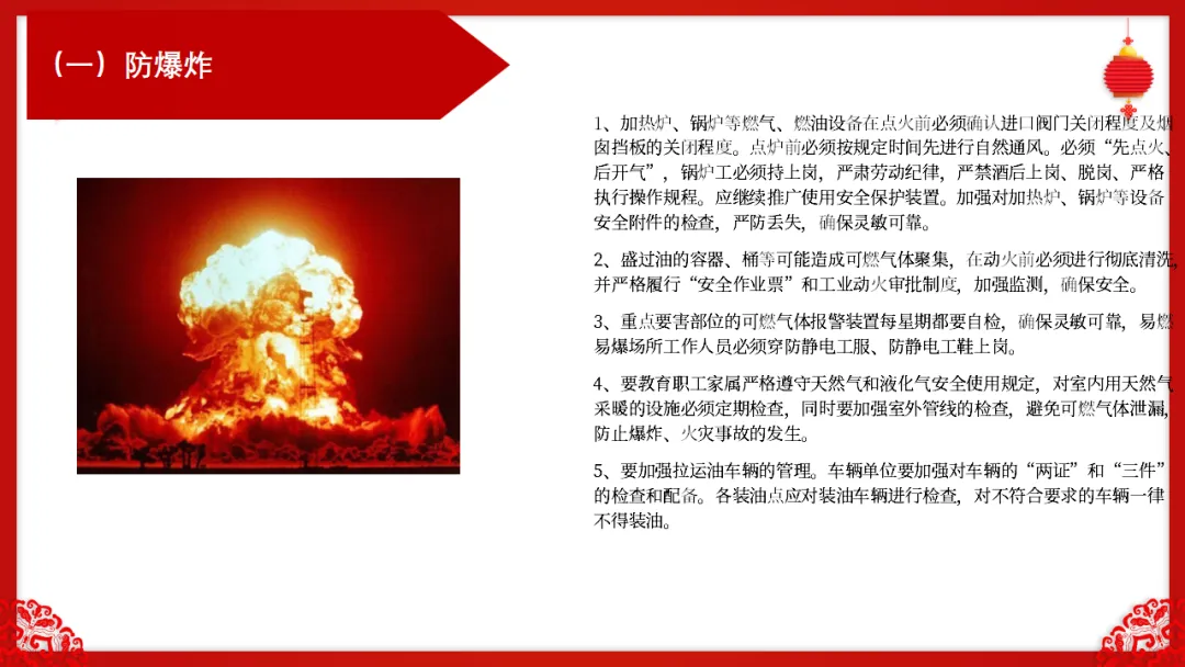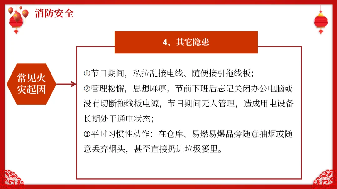 :各部门在放假前必须组织一次彻底的安全检查,重点排查: