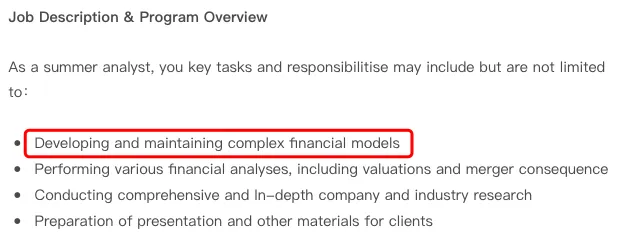 圈内就曾流传着一句话:想进投行,你可以没有CFA、CPA这些证书,但不能不会用Excel做估值建模!如果这还不能体现出估值建模重要性的话,那就来看看他们的Job Description👇🏻:再来看看参加过各大投行、券商实习/全职面试的学生们遇到的面试题:1️⃣ “面试官让我推荐一只股票给他,还要详细介绍运用到的估值方法和注意事项...”2️⃣ “被关在小黑屋3小时,现场用Excel来做估值建模...”所以你想进金融行业,从笔试到面试,都逃不掉面试官对你估值建模能力的考察!所以,想进阶成为一名合格的投行Banker的话,下面这个课程赶紧收好学起来!课程推荐: