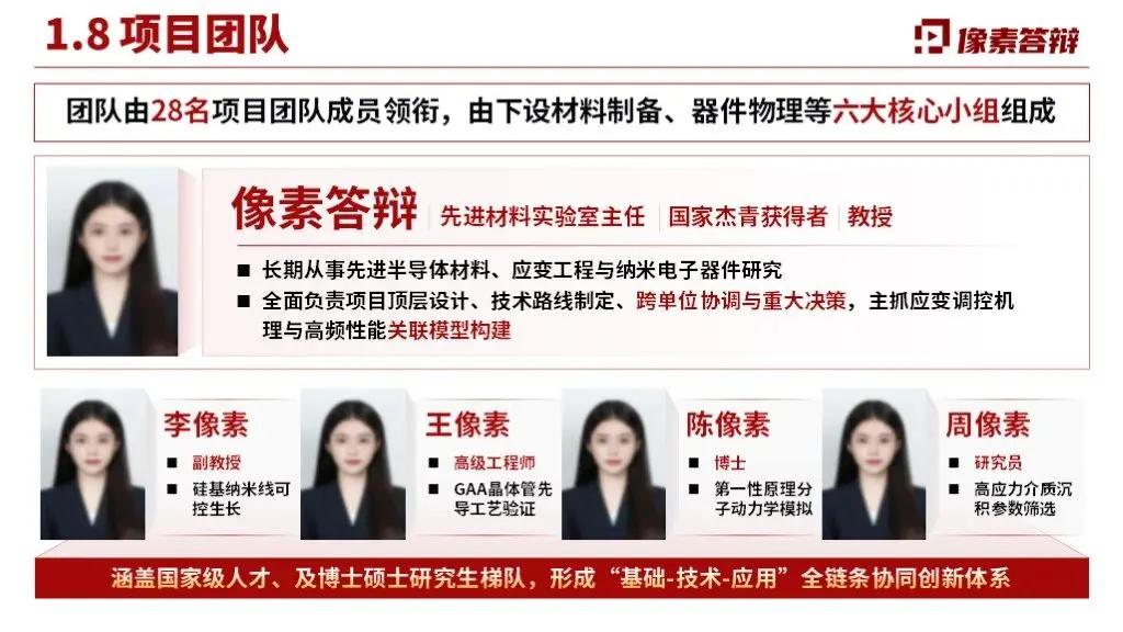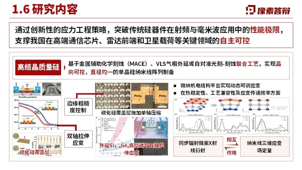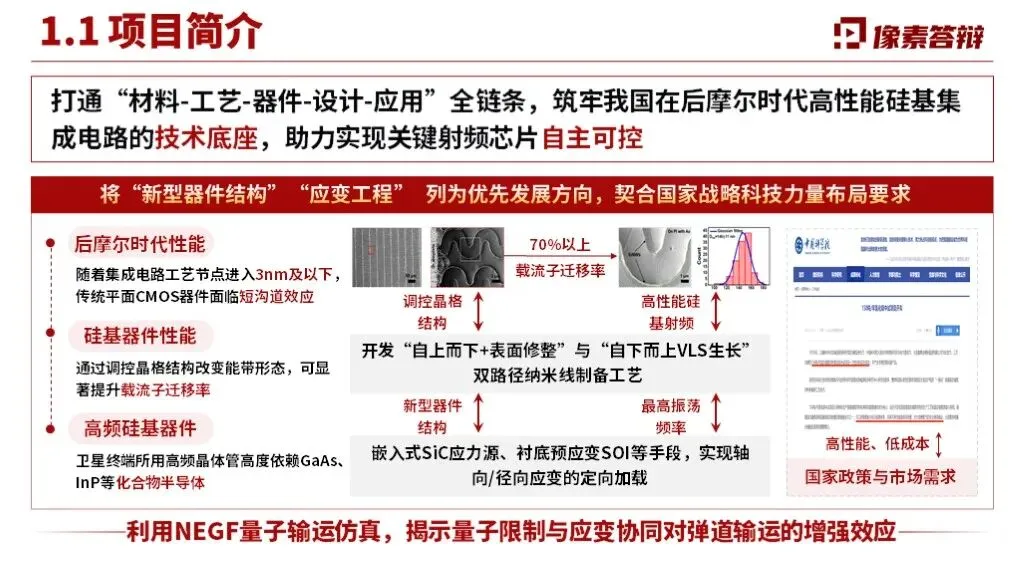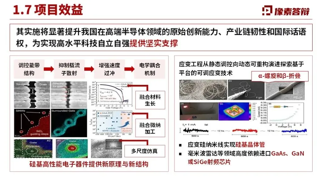 PPT采用“国家需求-技术瓶颈-创新体系-产业效益”递进框架,以应变硅纳米线为核心,贯穿机理研究、工艺集成、性能验证到射频芯片自主可控的完整链条,形成可迭代、可转化的系统化论证体系。