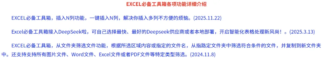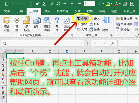 在按住Ctrl键的情况下,同时点击EXCEL必备工具箱的任意功能,都会直接打开该功能帮助网页,会详细介绍该功能的用法,并提供动画演示。