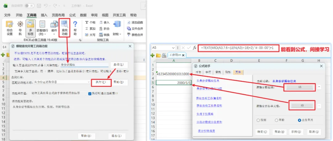 如果你记不住EXCEL必备工具箱某个功能名称,或者找不到那个功能在哪个菜单下面;再或者你有需求,却不知道EXCEL必备工具箱是否有对应功能,请点击【查找功能】按钮,并支持多关键字模糊查找。