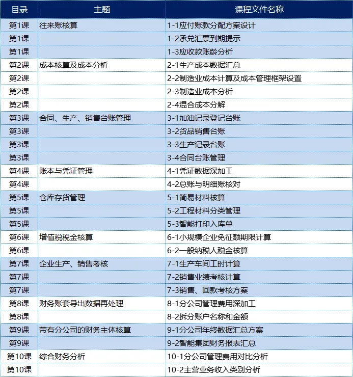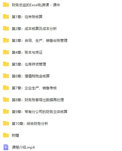 本期精选资料简介:包括:10节财务总监Excel学习课程,涉及账务处理、税务核算、成本管理、仓库管理等高清视频及并附有10节课的课件。