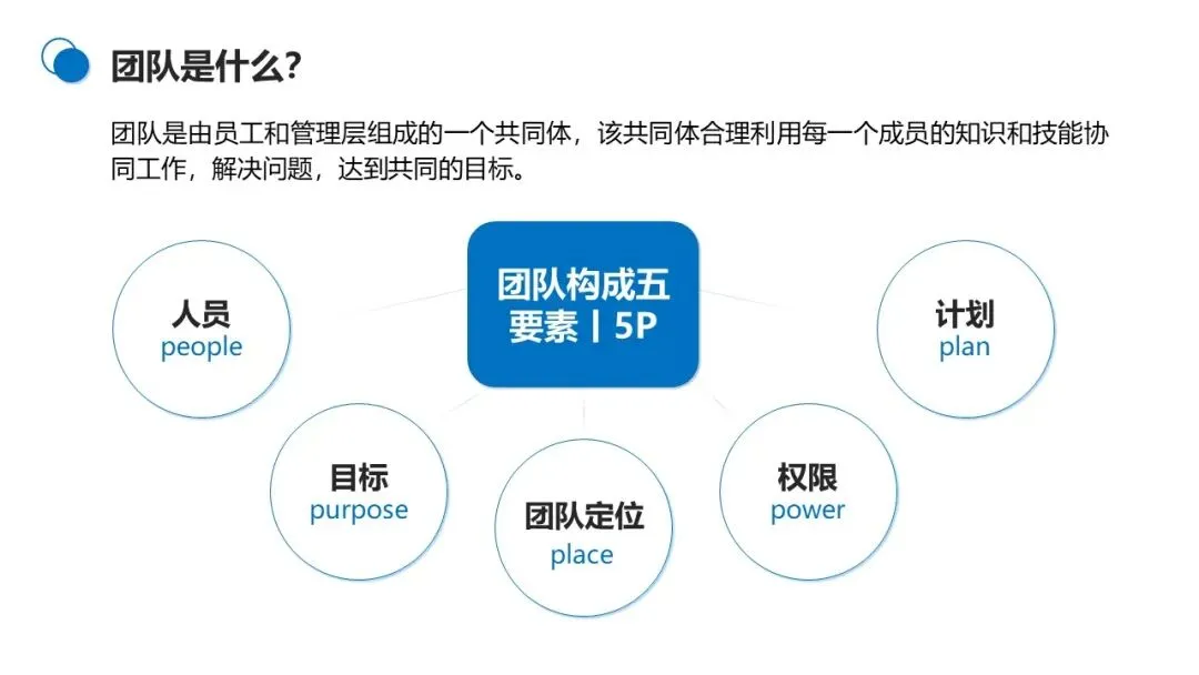 一个完整的团队由5P要素构成:目标(Purpose) 是团队的方向,人员(People) 是团队的核心载体,定位(Place) 明确团队在组织中的角色及成员分工,权限(Power) 界定团队的决策边界,计划(Plan) 是达成目标的路径。