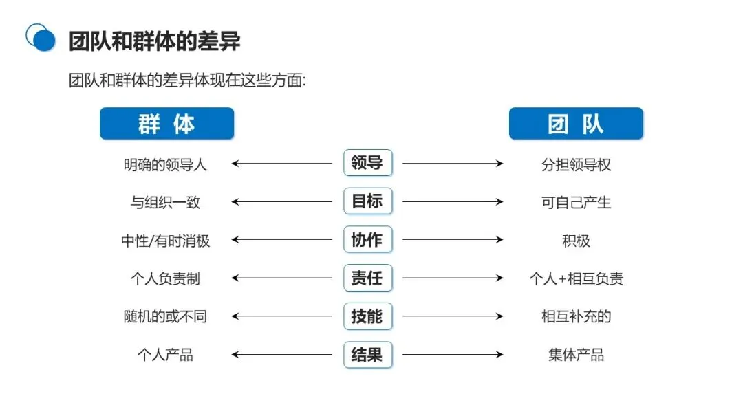团队:成员分担领导权,可自主生成目标,协作氛围积极,实行个人与相互负责制,技能互补形成合力,最终产出集体产品。