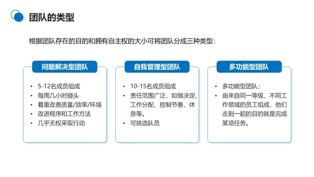 根据存在目的和自主权大小,团队可分为三类:一是问题解决型团队,5-12 名成员每周碰头几小时,聚焦改善质量与效率,但几乎无决策权;二是多功能型团队,由不同领域员工组成,核心任务是完成特定项目;三是自我管理型团队,10-15 名成员拥有广泛权限,可自主分配工作、控制节奏,甚至挑选队员。