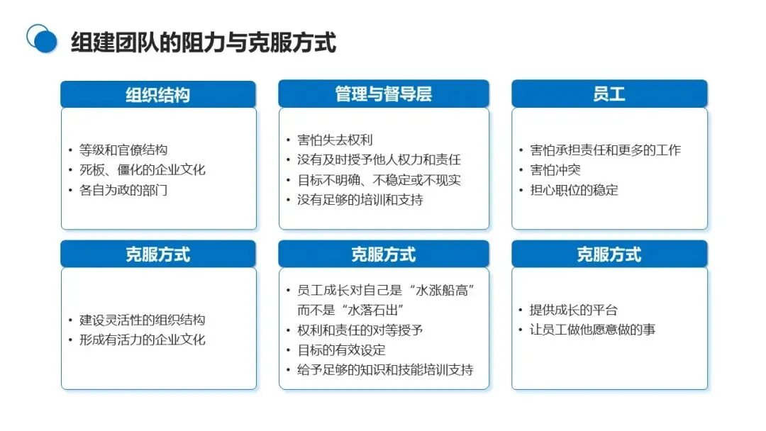 团队组建初期,会面临来自员工、管理督导层、组织结构三方面的阻力。员工害怕承担更多责任、担心职位不稳定;管理督导层存在权力下放不及时、目标设定不清晰的问题;组织结构则可能受限于等级森严、部门各自为政的弊端。