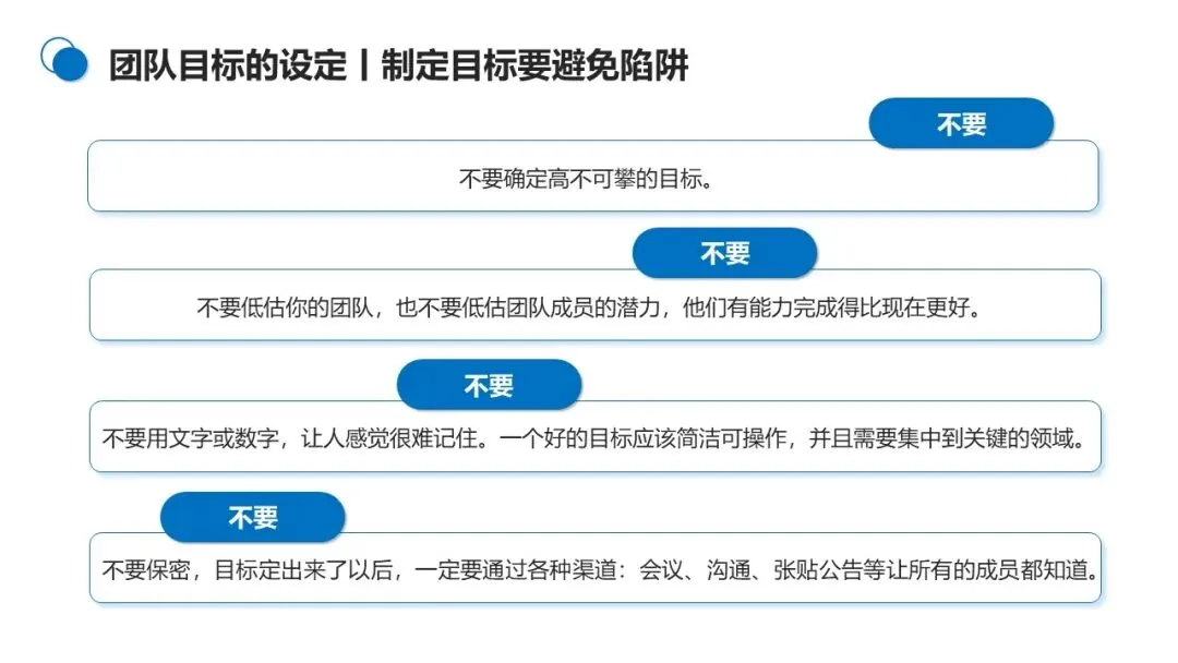 2. 规避陷阱:不设定高不可攀的目标,不低估团队潜力,目标表述要简洁易懂,且必须公开透明,让所有成员知晓。