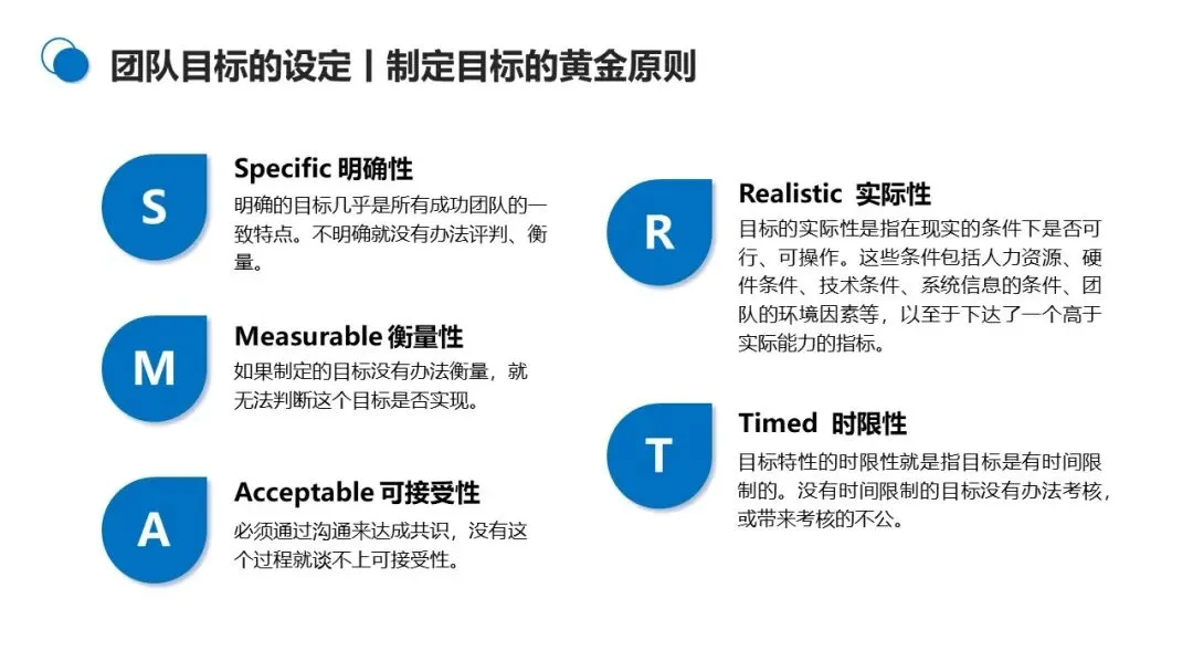 3. 遵循黄金法则:目标要符合SMART+A 原则,即具备明确性、可衡量性、可实现性、相关性、时限性,同时通过沟通达成成员的可接受性。