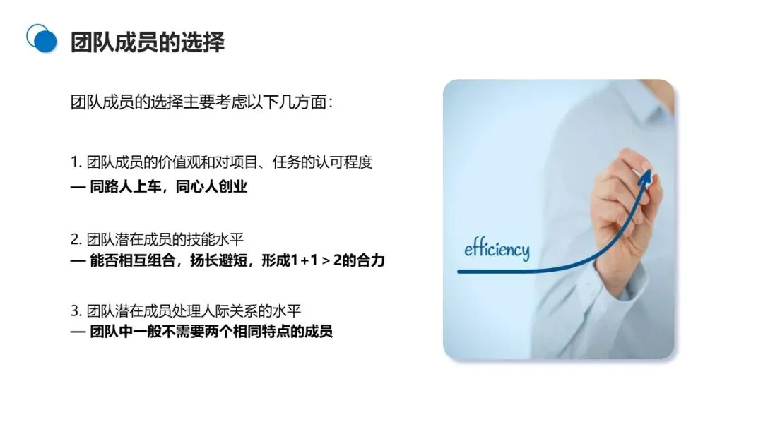 选对成员是团队高效运转的关键,挑选时要把握三个核心维度:一是价值观与项目认可度,确保成员与团队 “同频共振”;二是技能水平,成员技能要互补,形成合力;三是人际关系处理能力,避免团队中出现角色重叠导致的内耗。