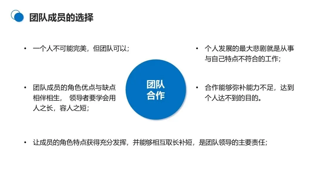 管理者要明白,个人不可能完美,但团队可以。用人之长、容人之短,让成员角色特点充分发挥,是团队领导的核心职责。