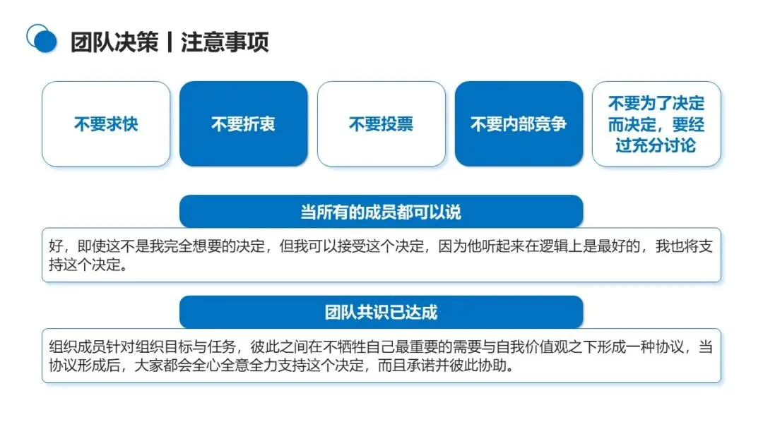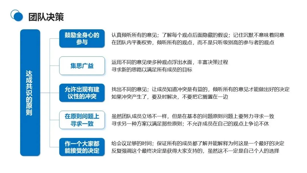 5-11 人是团队决策的最佳规模,这个规模既能集思广益,又能避免人多导致的效率低下。决策达成的理想状态是 “共识”—— 成员在不牺牲核心需求的前提下形成协议,即便不是个人最理想的决定,也会全力支持。