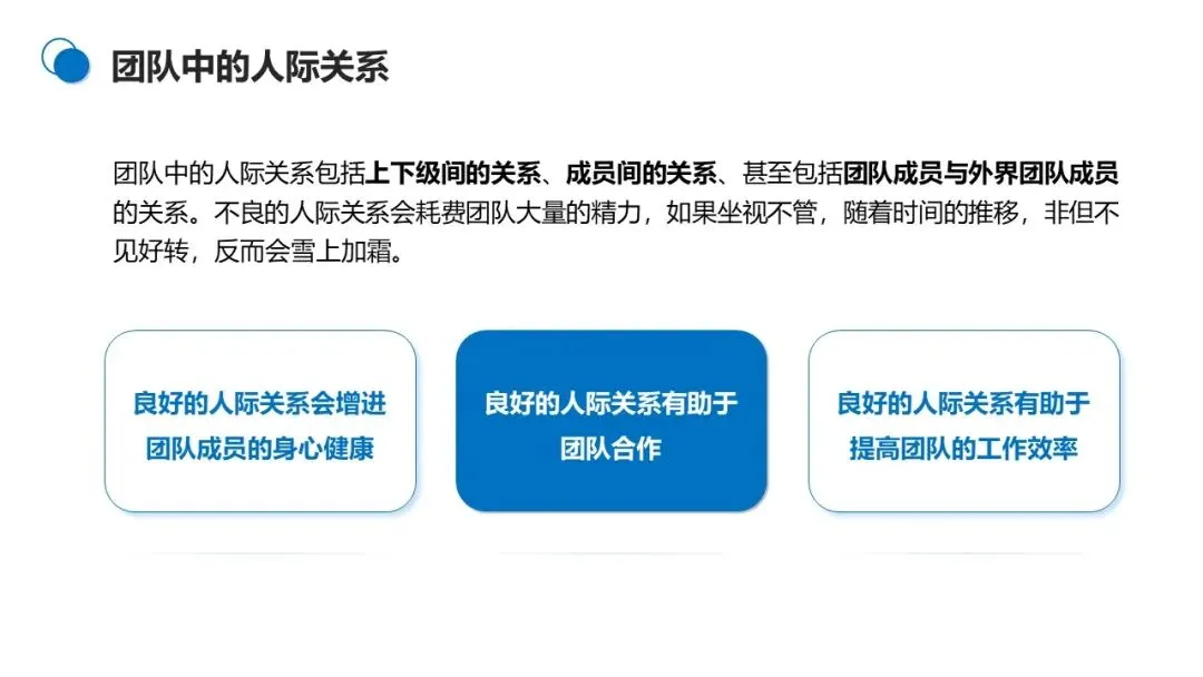 不良的人际关系会严重消耗团队精力,良好的人际关系则能提升工作效率、增进团队合作、助力成员身心健康。