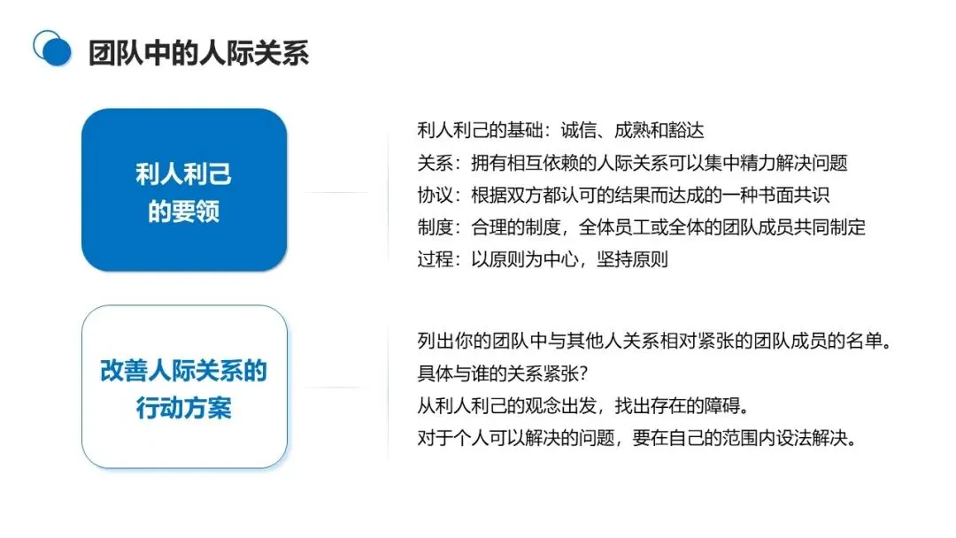 改善人际关系要以 “利人利己” 为核心,坚守诚信、成熟、豁达的原则,通过制定共同认可的协议和制度,化解成员间的紧张关系。