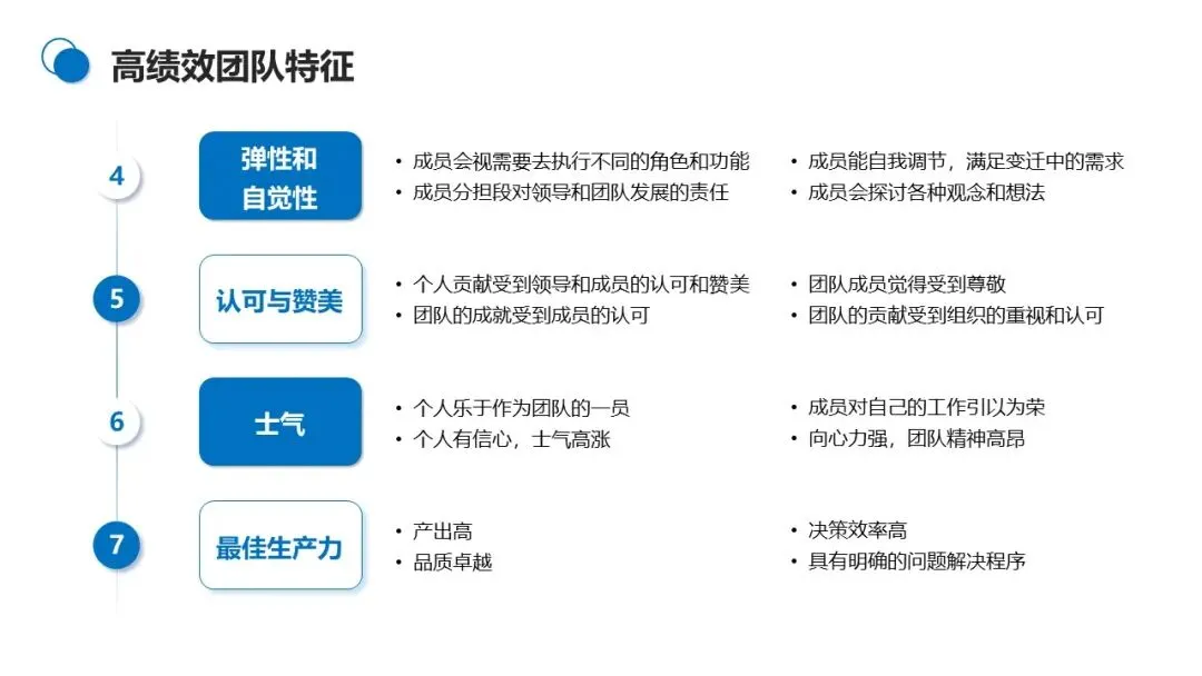 4. 弹性与自觉性兼备:成员可按需承担不同角色,主动分担团队领导和发展责任。