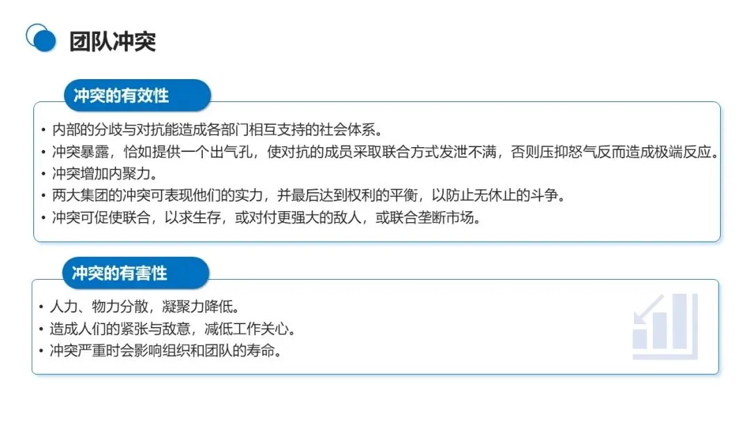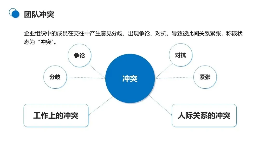 团队冲突分为工作冲突和人际关系冲突,并非所有冲突都是有害的。良性冲突能暴露问题、增加团队凝聚力、促进成员联合;恶性冲突则会分散资源、降低工作效率、影响团队寿命。