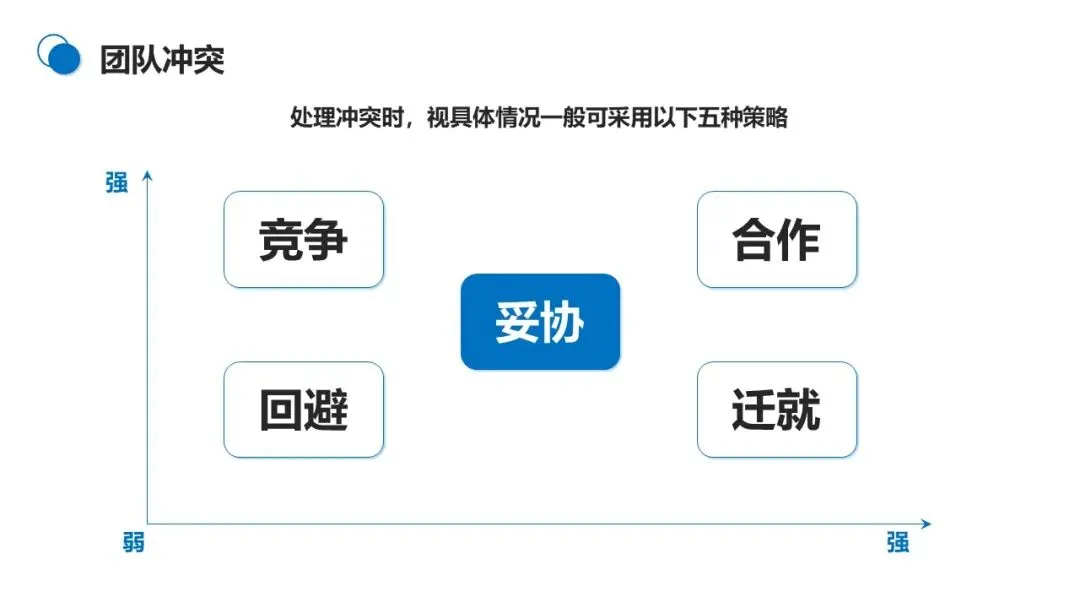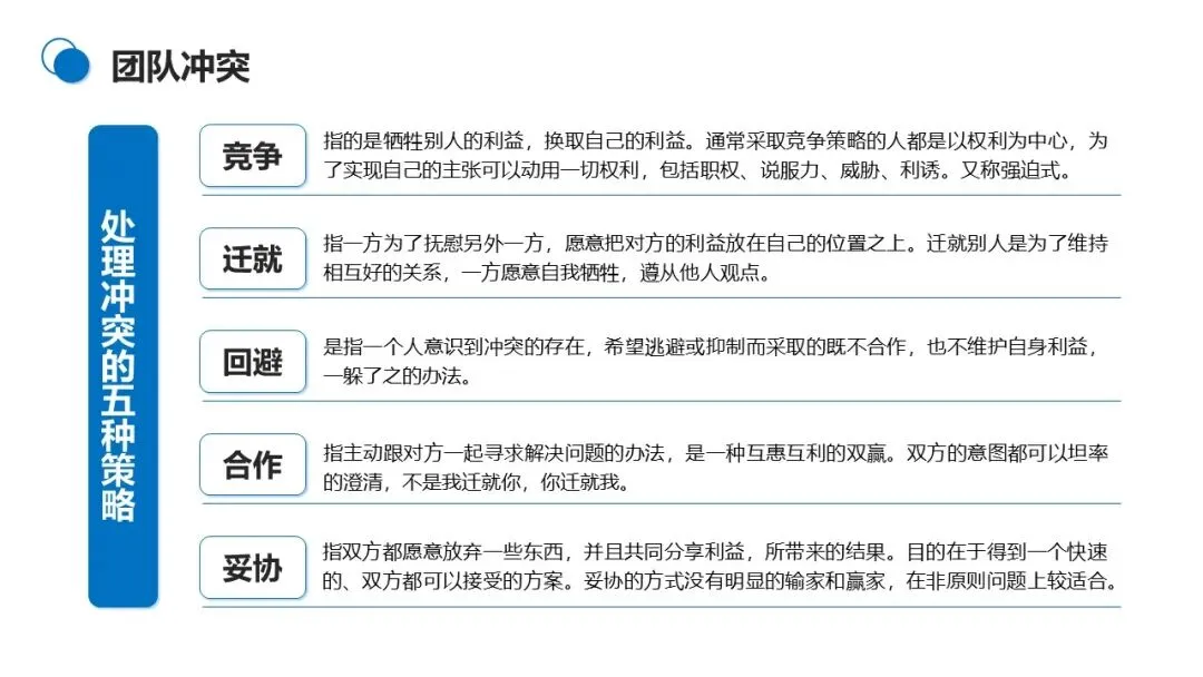 处理冲突有五种策略:竞争策略适合紧急情况,以牺牲对方利益换取自身利益;迁就策略用于维护关系,主动牺牲自身利益满足对方;回避策略适用于无关紧要的冲突,暂时搁置矛盾;合作策略是双赢选择,与对方共同寻找解决方案;妥协策略适合非原则问题,双方各让一步达成共识。