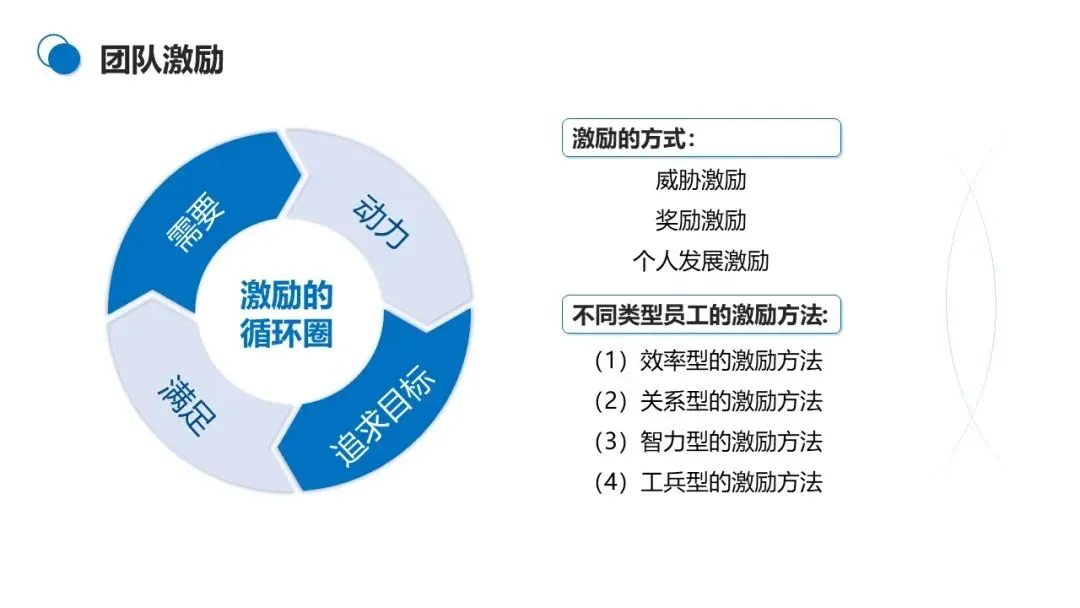 激励方式可分为威胁激励、奖励激励、个人发展激励,针对不同类型员工要差异化施策:对效率型员工强调结果导向,对关系型员工注重团队氛围,对智力型员工给予创新空间,对工兵型员工肯定其踏实付出。