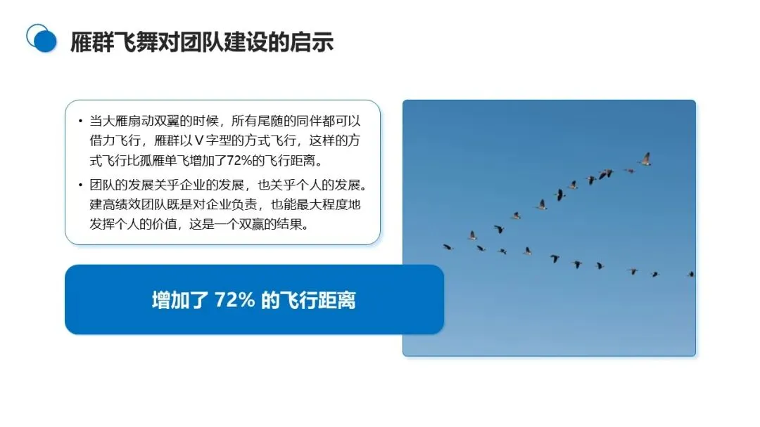 大雁群飞的 V 字阵型,能让每只大雁借力飞行,比单飞增加 72% 的距离。这正是团队的价值所在 —— 个体的力量有限,团队的合力无穷。
