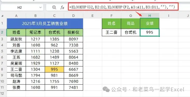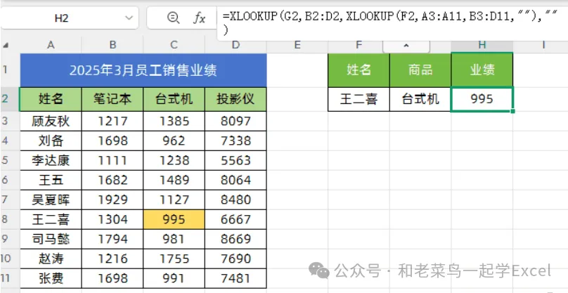 内层 XLOOKUP 按员工名找到对应 整行数据 ;