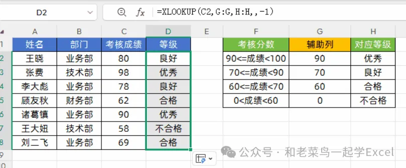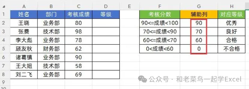关键 是辅助列 G列 必须是从大到小排列的 各等级下限分数 。我当年这里栽过跟头,顺序一乱,结果全错。