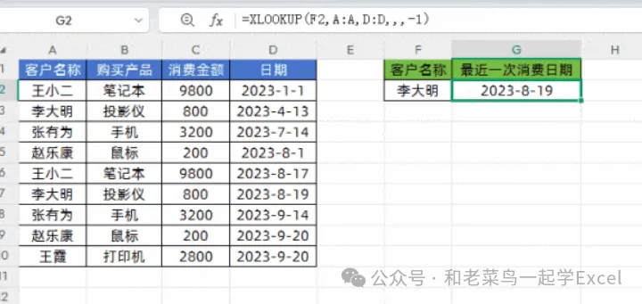 老鸟版公式 : =XLOOKUP(F2, A:A, D:D, , , -1)