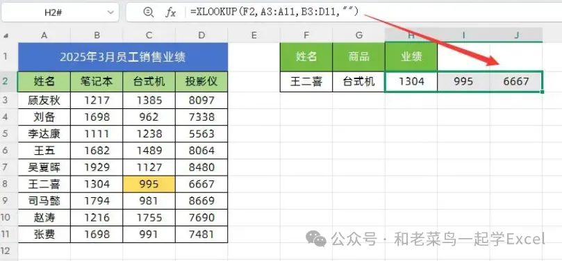 下面,我用8个你肯定会遇到的实战场景,给你拆解得明明白白。老鸟版公式 : =XLOOKUP(F2, A:A, D:D, "未找到")校长解读 :在A列找F2的内容,找到后,直接返回同行D列的值。比 VLOOKUP 直观一万倍,告别 column 函数辅助。痛点 :要查“台式机”和“投影仪”两个单价,难道要写两次公式?老鸟版公式 : =XLOOKUP(F2:F3, A:A, D:D, "")校长解读 :查找值直接框选 F2:F3 区域,结果 自动溢出 。省时省力,数组思维的初级体现。老鸟版公式 : =XLOOKUP(G2, C:C, B:B, "")校长解读 :直接在姓名列 C:C 找 G2 ,返回工号列 B:B 。无需调整列顺序,也无需 INDEX+MATCH 组合拳, 一步到位 。痛点 :要根据“姓名”+“部门”两个条件,查考核成绩。老鸟版公式 : =XLOOKUP(F3&G3, B3:B9&C3:C9, D3:D9, "")校长解读 :用 & 把两个条件(如“张三销售部”)拼接成一个新条件,同时也在两列区域 B3:B9&C3:C9 里拼接查找。逻辑清晰,公式简洁。痛点 :根据员工和商品两个维度,在二维表里查销售额。老鸟版公式 : =XLOOKUP(G2, B2:D2, XLOOKUP(F2, A3:A11, B3:D11)) 内层 XLOOKUP 按员工名找到对应 整行数据 ; 外层 XLOOKUP 在这行数据里,按商品名定位到最终单元格。逻辑如手术刀般精准。痛点 :根据分数,自动匹配“优秀”、“良好”等级别。老鸟版公式 : =XLOOKUP(C2, G:G, H:H, , -1)校长踩坑点 :这里第5参数(匹配模式)设为 -1 ,代表“精确匹配或下一个较小项”。 关键 是辅助列 G列 必须是从大到小排列的 各等级下限分数 。我当年这里栽过跟头,顺序一乱,结果全错。痛点 :只记得合同名里有个“框架”关键词,想查金额。老鸟版公式 : =XLOOKUP(""&D2&"", A2:A7, B2:B7, "", 2)校长解读 :用 "*" 通配符包裹关键词,第5参数选 2 (通配符模式)。老鸟版公式 : =XLOOKUP(F2, A:A, D:D, , , -1)校长解读 :精髓在最后一个参数(搜索模式)设为 -1 ,代表 从下往上搜 。自然就找到了最后一条记录,分析最新行为的神技。先替换,后创新:从手头最简单的VLOOKUP任务开始替换,先熟悉基本用法。重点攻克“参数三兄弟”:把最后三个可选参数(未找到值、匹配模式、搜索模式)的各种组合玩明白,你就真正“出师”了。组合才是王道:像案例5那样,XLOOKUP可以嵌套自己,也能和其他函数(如FILTER)强强联合,解决更复杂问题。总结一下 :XLOOKUP不是来锦上添花的,它是来 从根本上提升你数据处理效率 的。掌握这八大场景,90%的查找难题都能优雅化解。版本提醒 :如果你的WPS/Excel弹出“无效函数名”,请务必更新到最新版。这么好的工具,别让版本耽误了。如果你想更深入地玩转动态数组,探索 XLOOKUP 与 FILTER 、 SORT 等新函数的组合技,评论区告诉我,咱们下次可以专门聊聊。我是老菜鸟,一个陪你解决实际问题的Excel老兵。觉得有用,不妨点个赞,你的支持是我分享的最大动力。