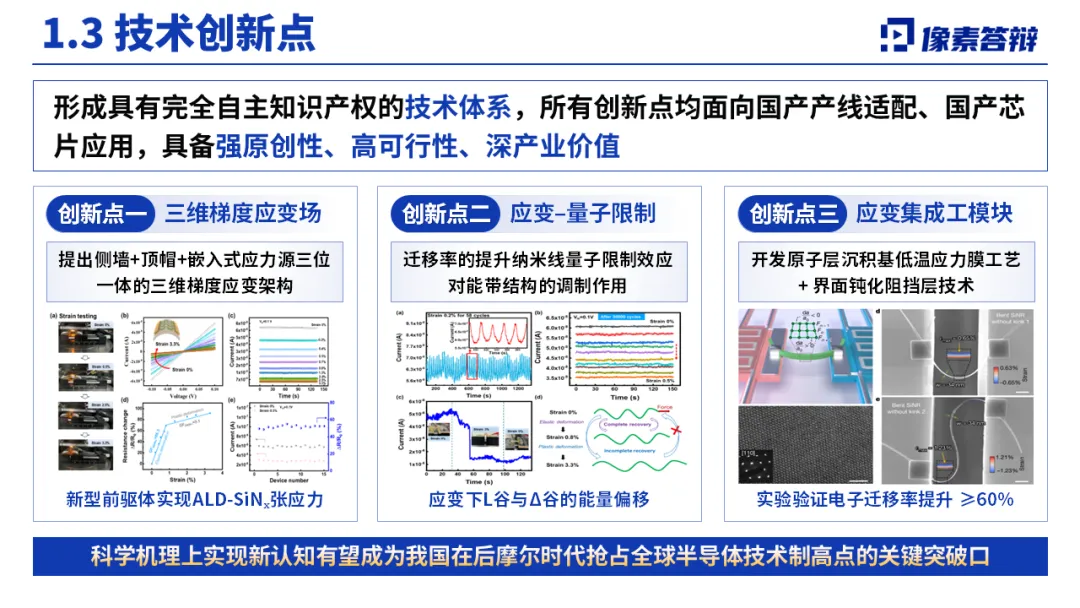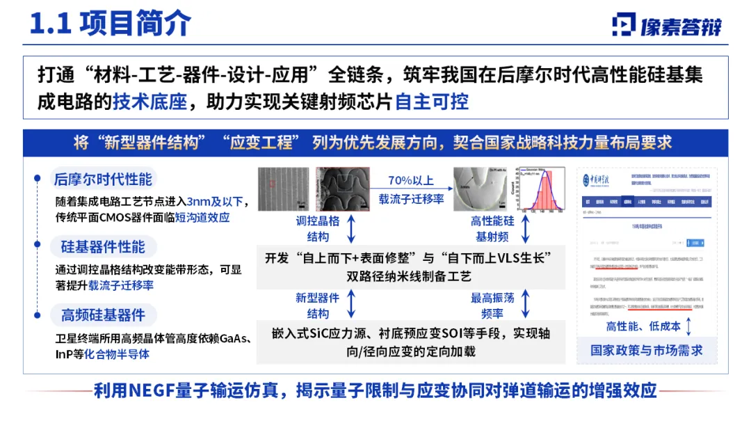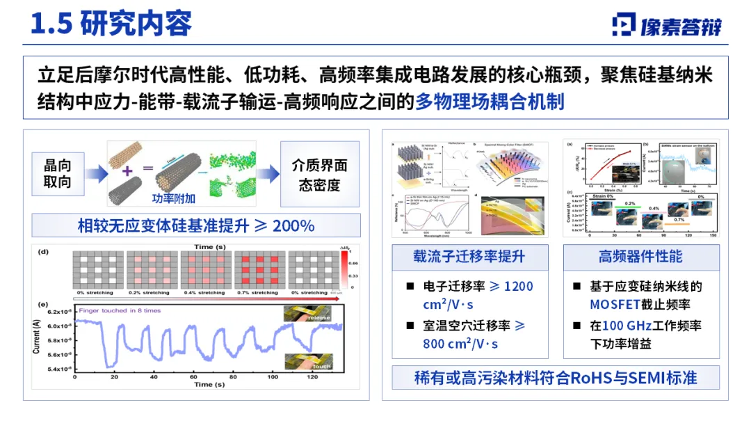 本项目契合国家半导体技术战略布局,针对后摩尔时代硅基器件短沟道效应、高频晶体管依赖进口化合物半导体的痛点,以打通 “材料 - 工艺 - 器件 - 设计 - 应用” 全链条为核心,开展应变硅纳米线应力工程研究。核心创新点为三维梯度应变场、应变 - 量子限制协同、应变集成工艺模块三大方向,实验验证电子迁移率提升≥60%。制定了明确技术指标,如电子迁移率≥1200 cm²/V・s、界面态密度 RMS≤0.3 nm 等,聚焦应力 - 能带 - 载流子输运 - 高频响应多物理场耦合机制,开发了纳米线制备、多维度应力调控等关键工艺,突破传统硅器件射频性能极限。