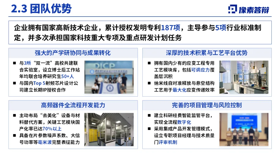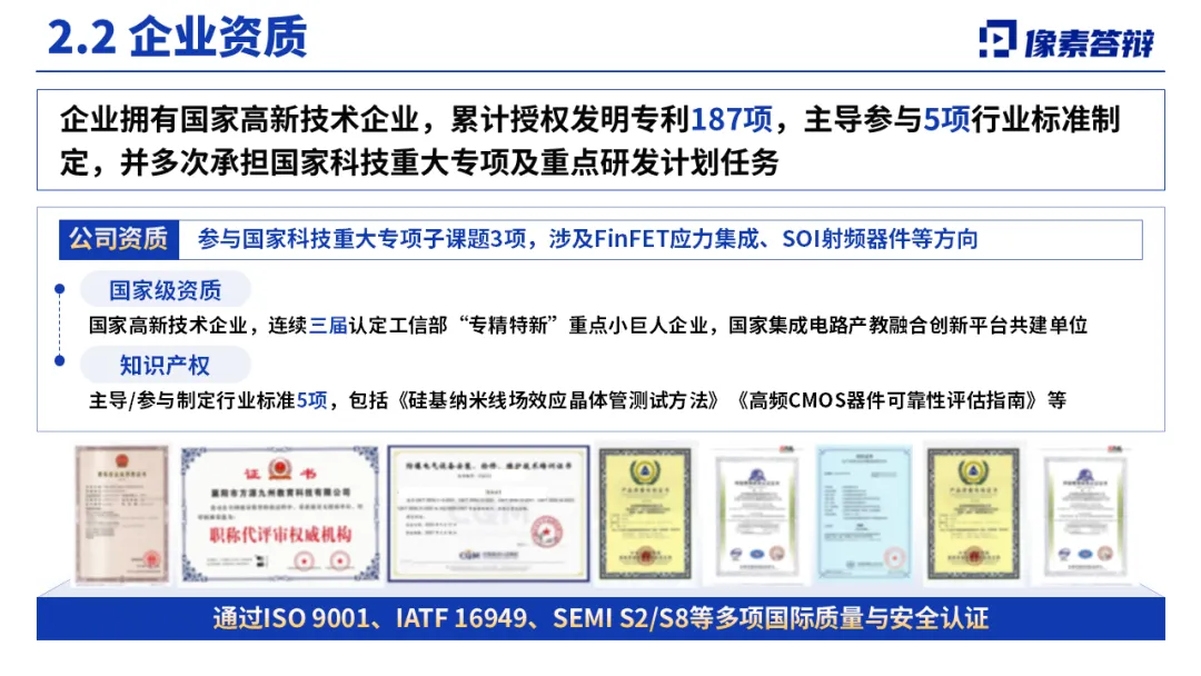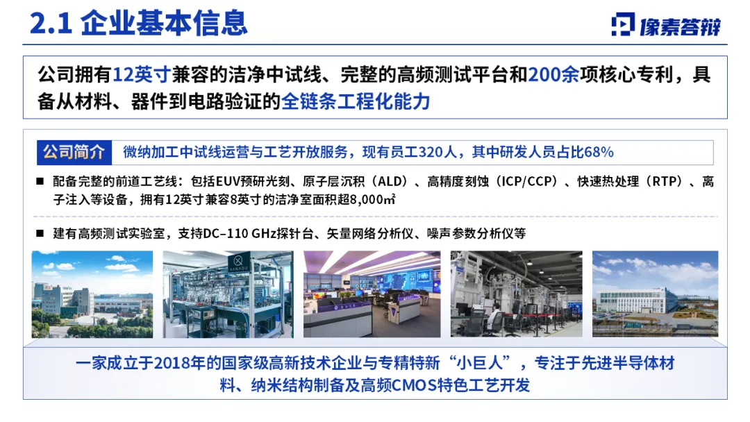 合作企业为 2018 年成立的国家级高新技术企业、专精特新 “小巨人”,具备全链条工程化能力。硬件上拥有 12 英寸兼容洁净中试线、8000㎡洁净室,配备 EUV 预研光刻等完整前道设备及 DC–110 GHz 高频测试平台;资质上获 187 项发明专利,主导 / 参与 5 项行业标准制定,承担国家科技重大专项,通过多项国际质量与安全认证;技术上拥有应变工程专用工艺模块库,关键工艺国产化率超 70%,且与双一流高校、头部射频芯片公司建立深度产学研合作。